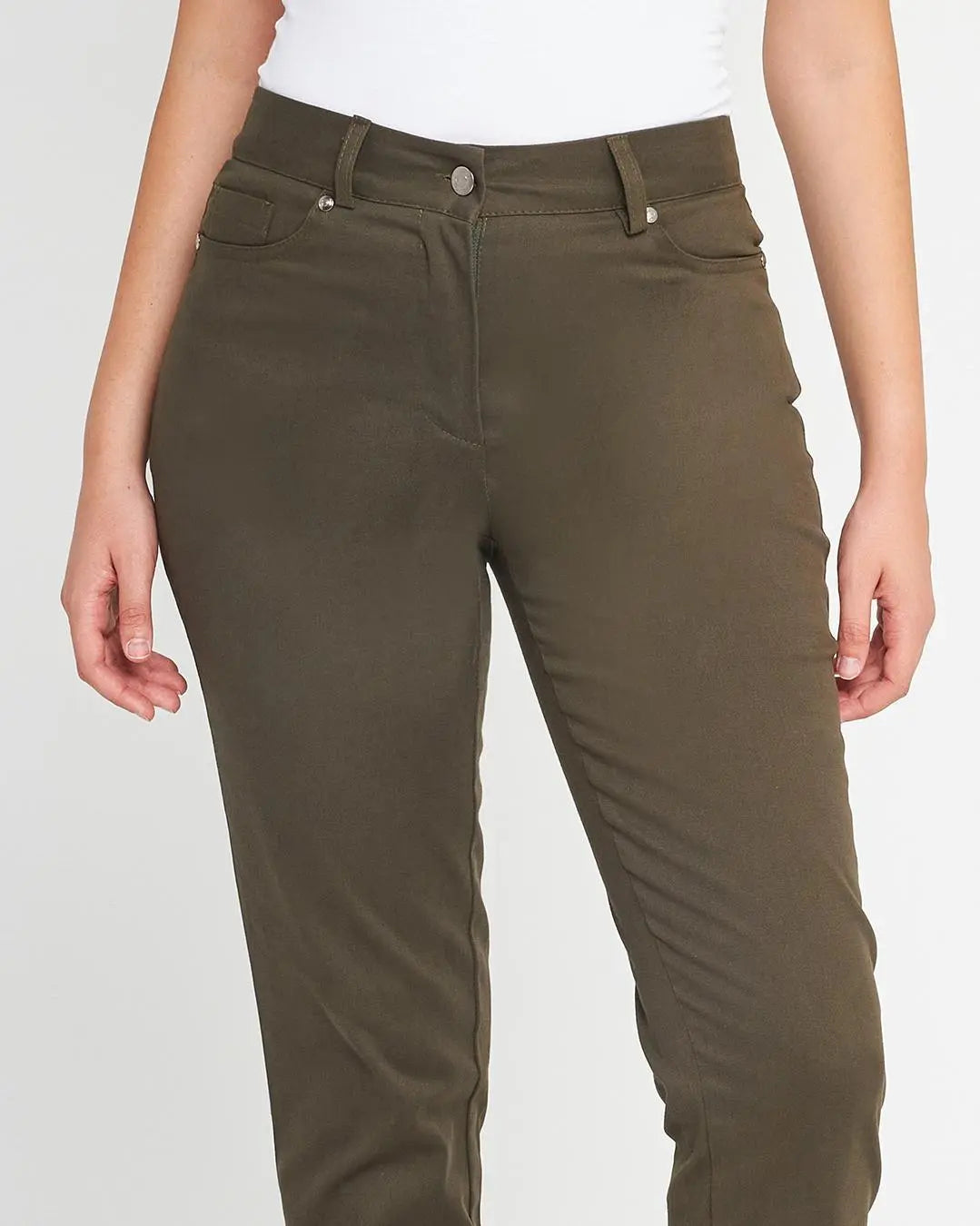 Pantalone 5 tasche con tasca ricamata e dettagli strass e bottone e zip. Vestibilià regular