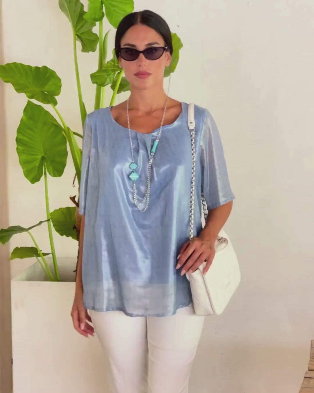 Geometric patterned blouse with crew neck and gathered LIGHT BLUE