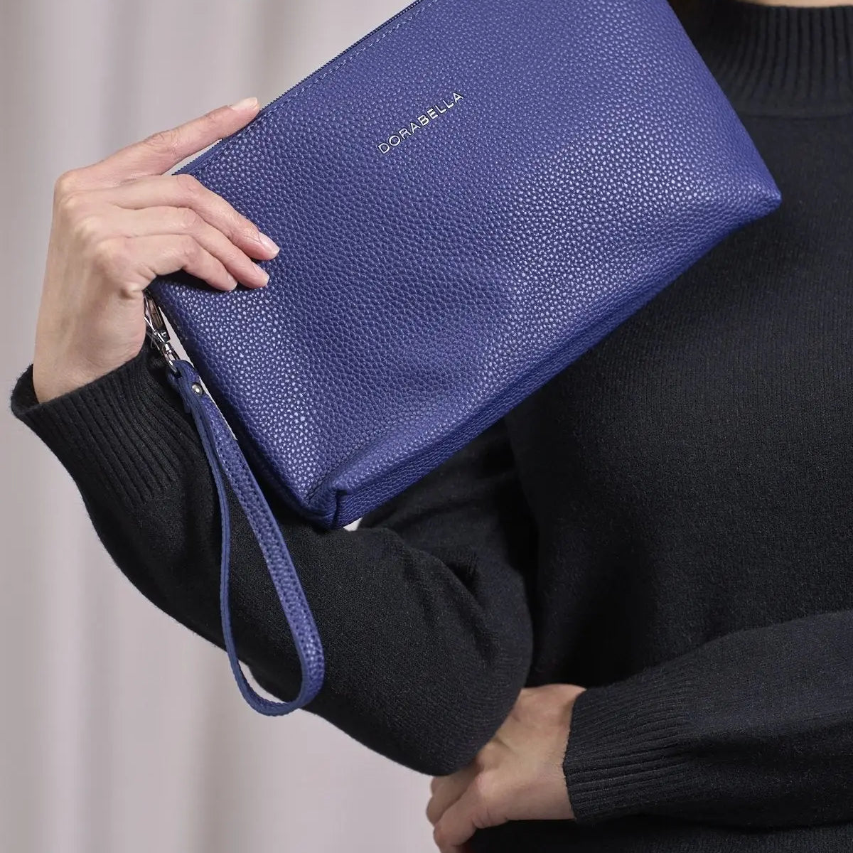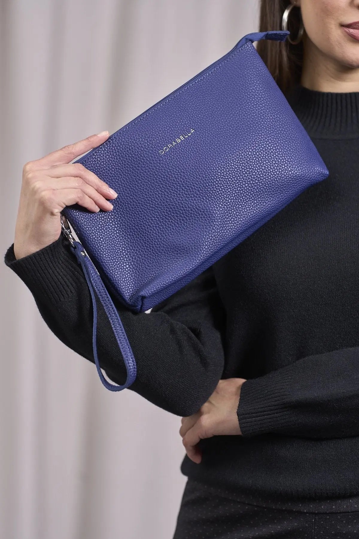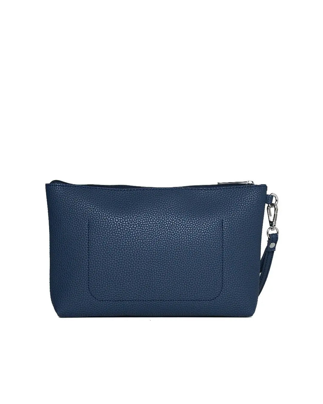 Grained eco-leather clutch with logo on the front and BLUE wrist strap