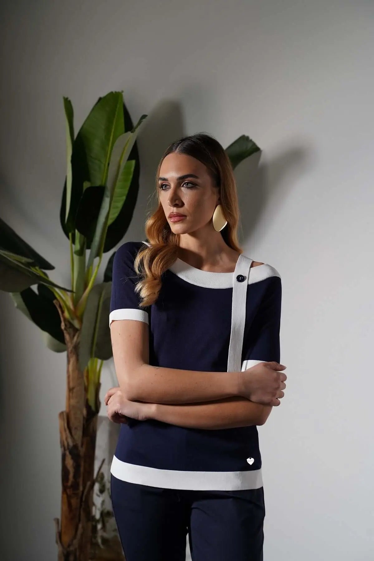 Short-sleeved shirt in viscose blend yarn with contrasting BLUE edges