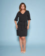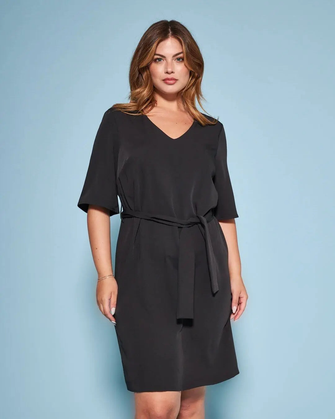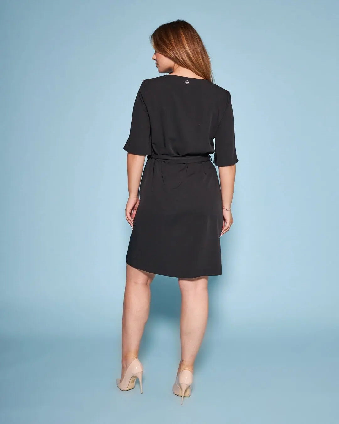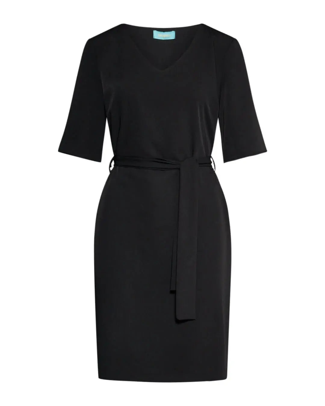 Stretch cady short-sleeved dress with belt at the waist BLACK