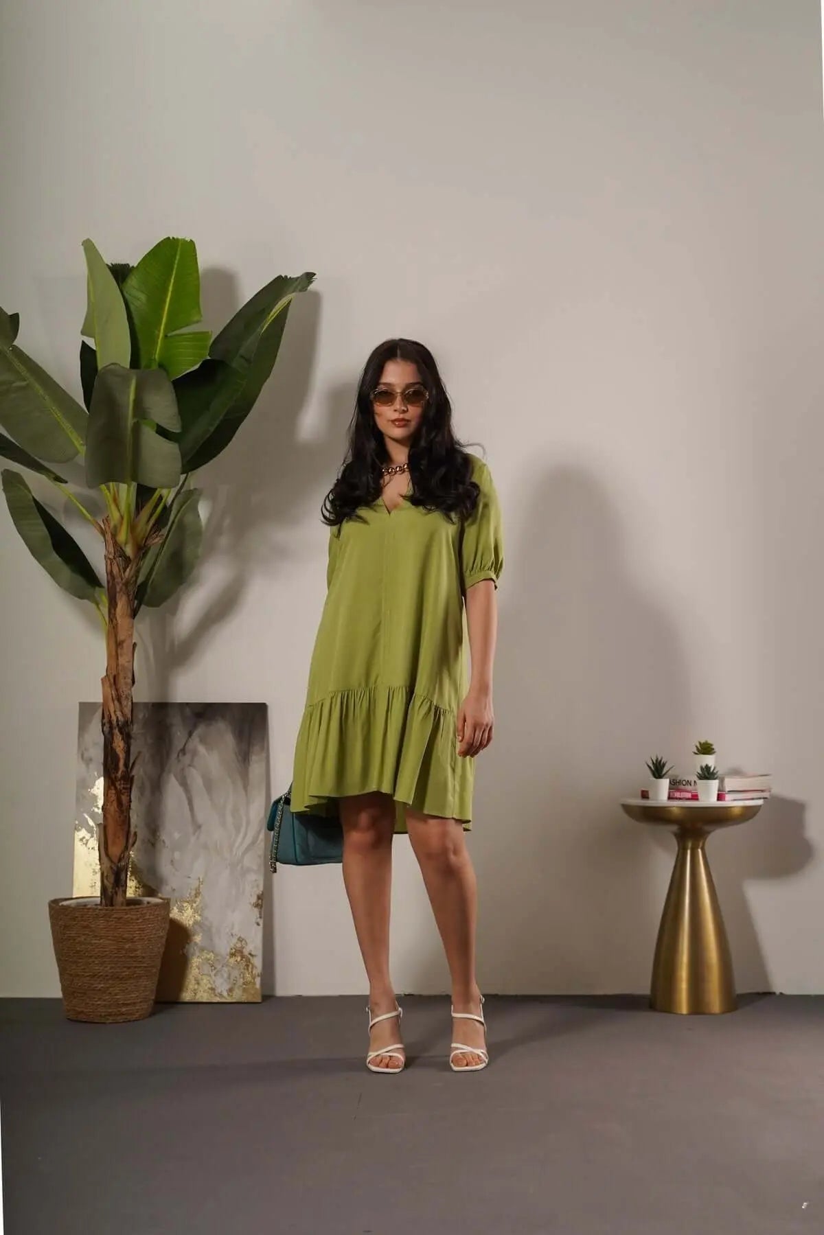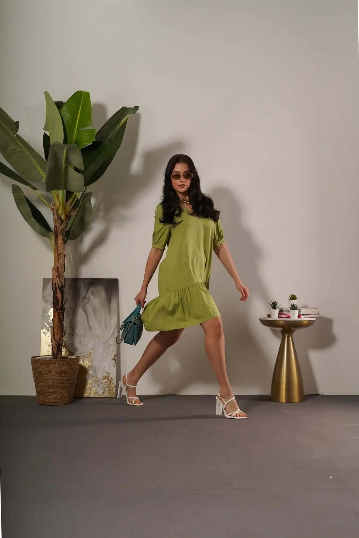 Solid color rayon short sleeve mini dress with flounce at the bottom. PISTACHIO