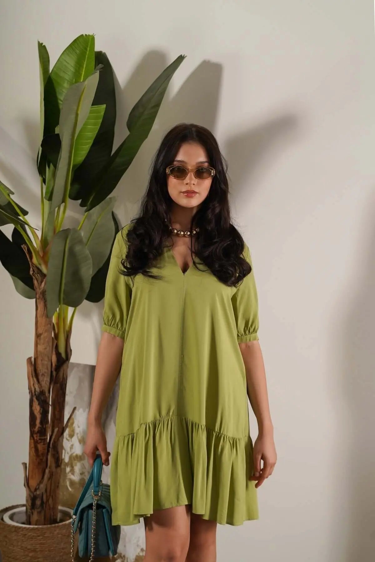 Solid color viscose dress. Boho attitude, fluid silhouette and breathable and light fabric make this minidress a perfect ally of the summer season. Designed with a deep V-neck, topped by a small standing collar, short sleeves slightly gathered and the cut below the hips with the maxi flounce that enlivens the bottom. Regular fit.