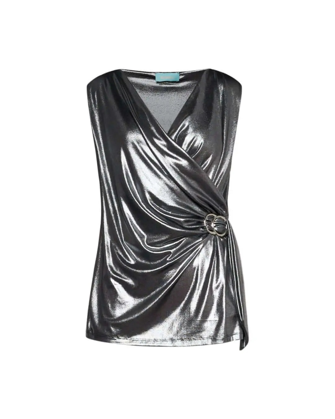 Sleeveless top in stretch lamé jersey with metal ring detail. SILVER