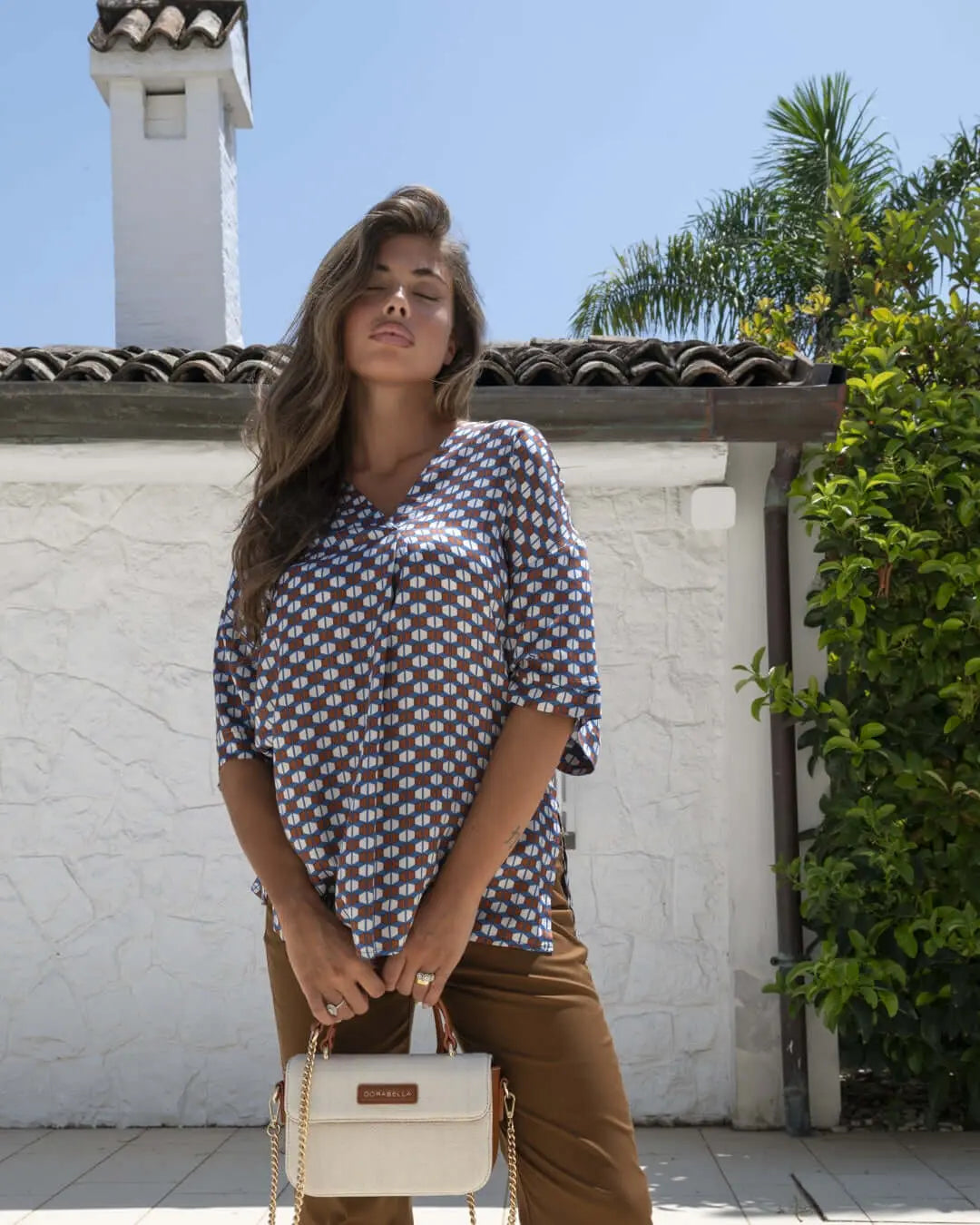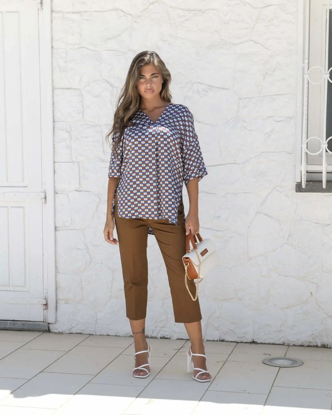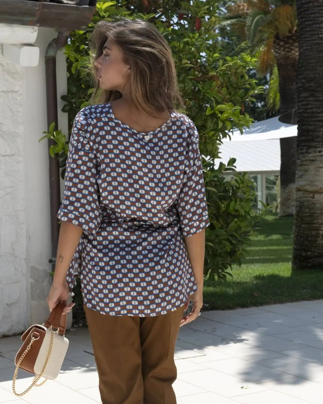 V-neck tunic in viscose satin with multi-coloured pattern. BLUETTE