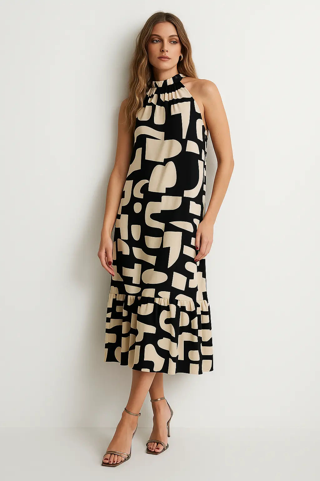 Elegante e contemporaneo, questo abito lungo è la scelta ideale per distinguersi con stile durante la stagione calda. Realizzato in un leggero tessuto stampato, si caratterizza per il suo design con scollo all’americana e giromanica a vogatore, che valorizza le spalle con femminilità. La balza sul fondo aggiunge volume e movimento, mentre la stampa grafica in verde militare dona un tocco moderno e versatile. Perfetto sia per il giorno con sandali flat che per la sera con accessori più sofisticati.