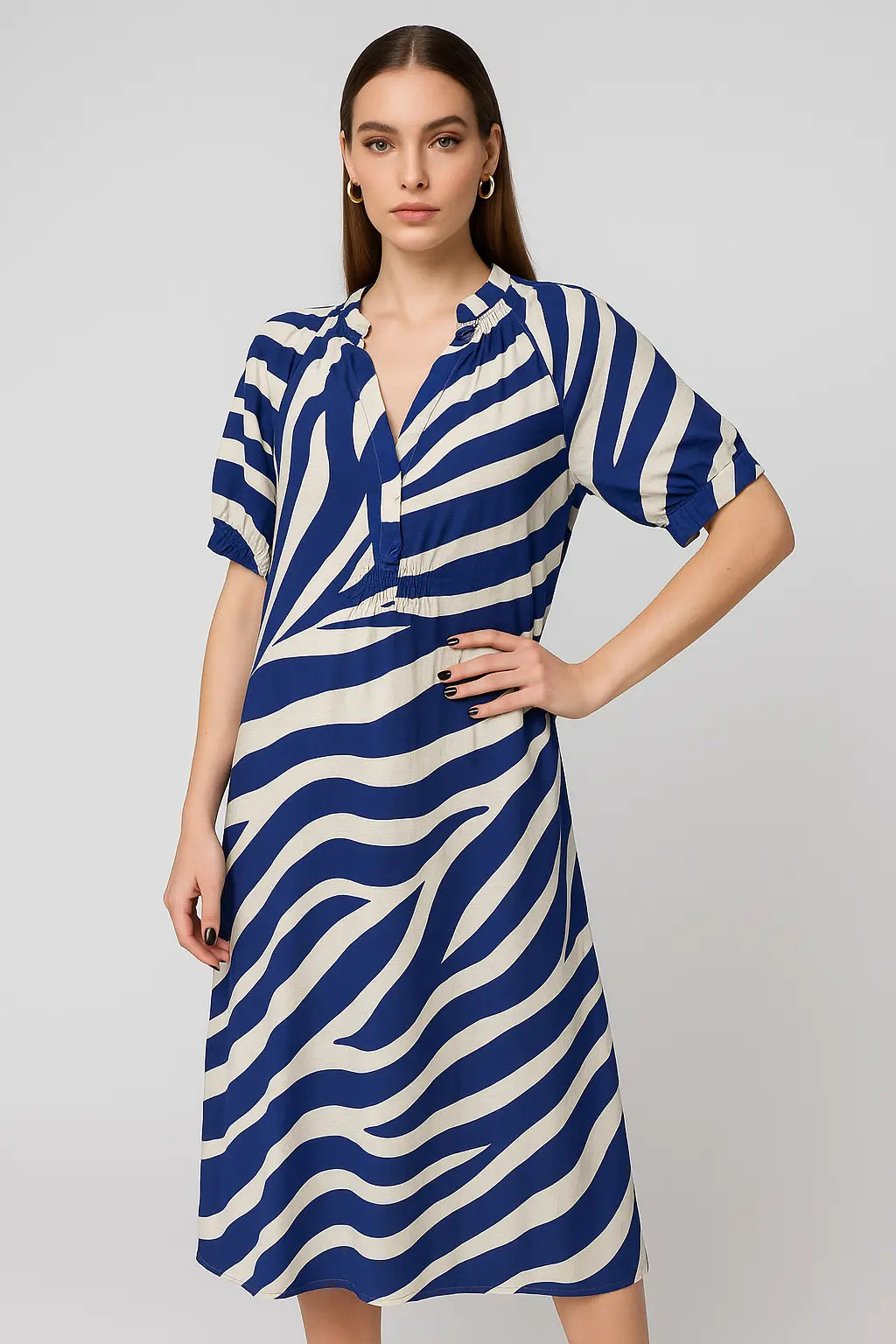 Questo abito ambio in tessuto viscosa stampato con scollo a v e mezza manica è perfetto per una giornata di vacanza al mare. Il suo design midi e fantasia dona un look alla moda e la morbida viscosa assicura comfort e stile. Aggiungi un tocco di eleganza al tuo guardaroba con questo abito versatile.