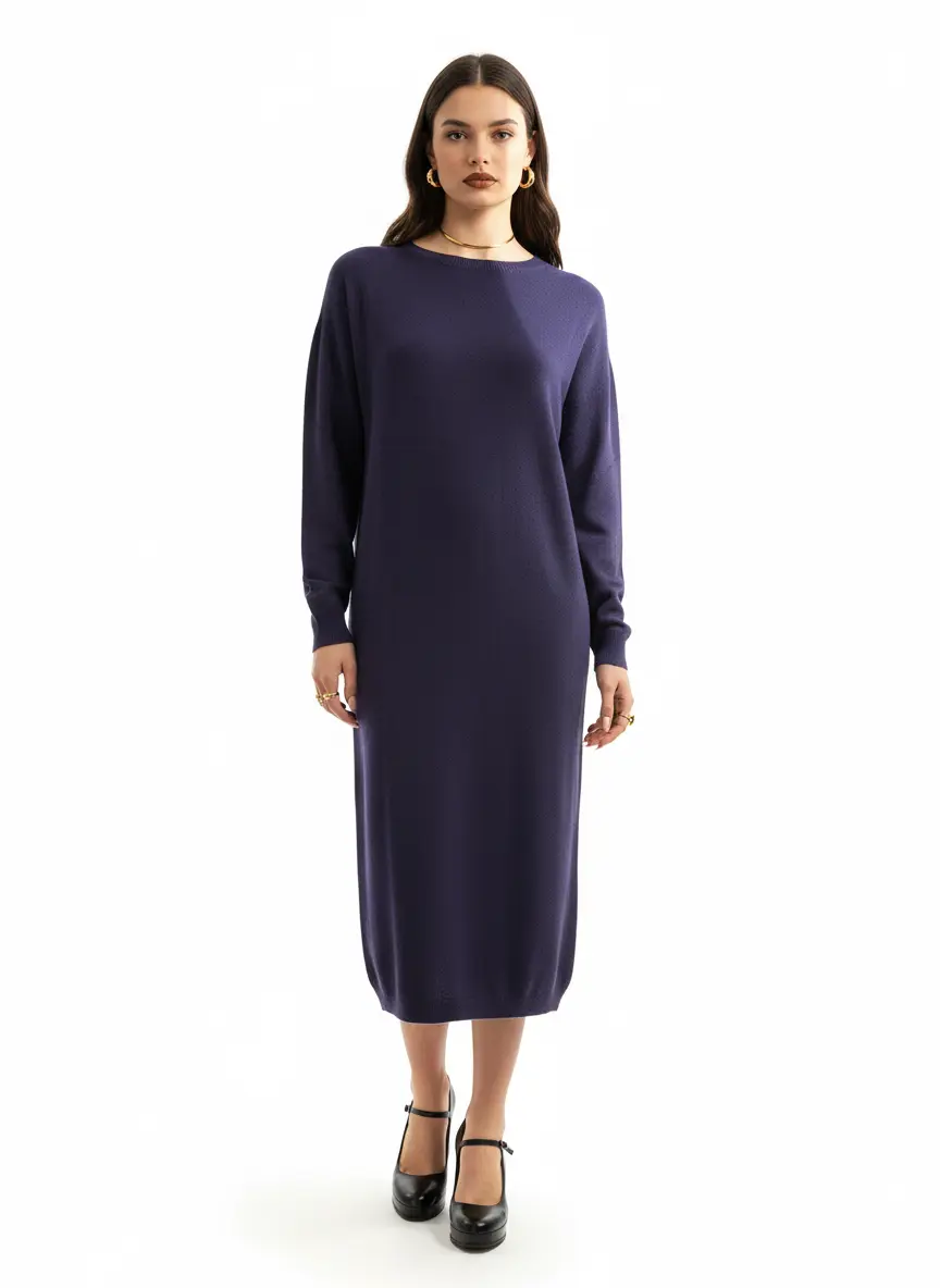 Questo abito in maglia a tinta unita, proposto nelle tonalità nero, caffè e viola, presenta una linea pulita e fluida che valorizza la silhouette con naturalezza.