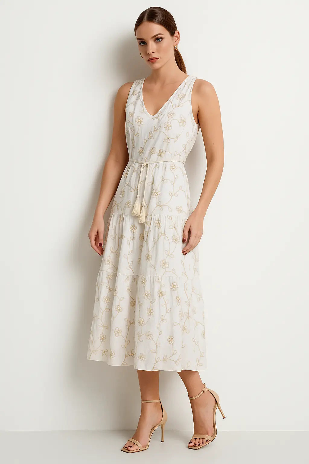 Romantico e femminile, questo abito lungo in cotone è la scelta perfetta per le giornate estive più calde. Realizzato in un leggero tessuto a base di cotone, presenta un elegante ricamo floreale a contrasto che dona carattere e movimento. La silhouette è morbida e svasata, valorizzata da una sottile cinturina in corda con nappine decorative che esalta delicatamente il punto vita. Il design senza maniche e lo scollo a V aggiungono un tocco di freschezza e versatilità, ideale da indossare sia in città che in vacanza.