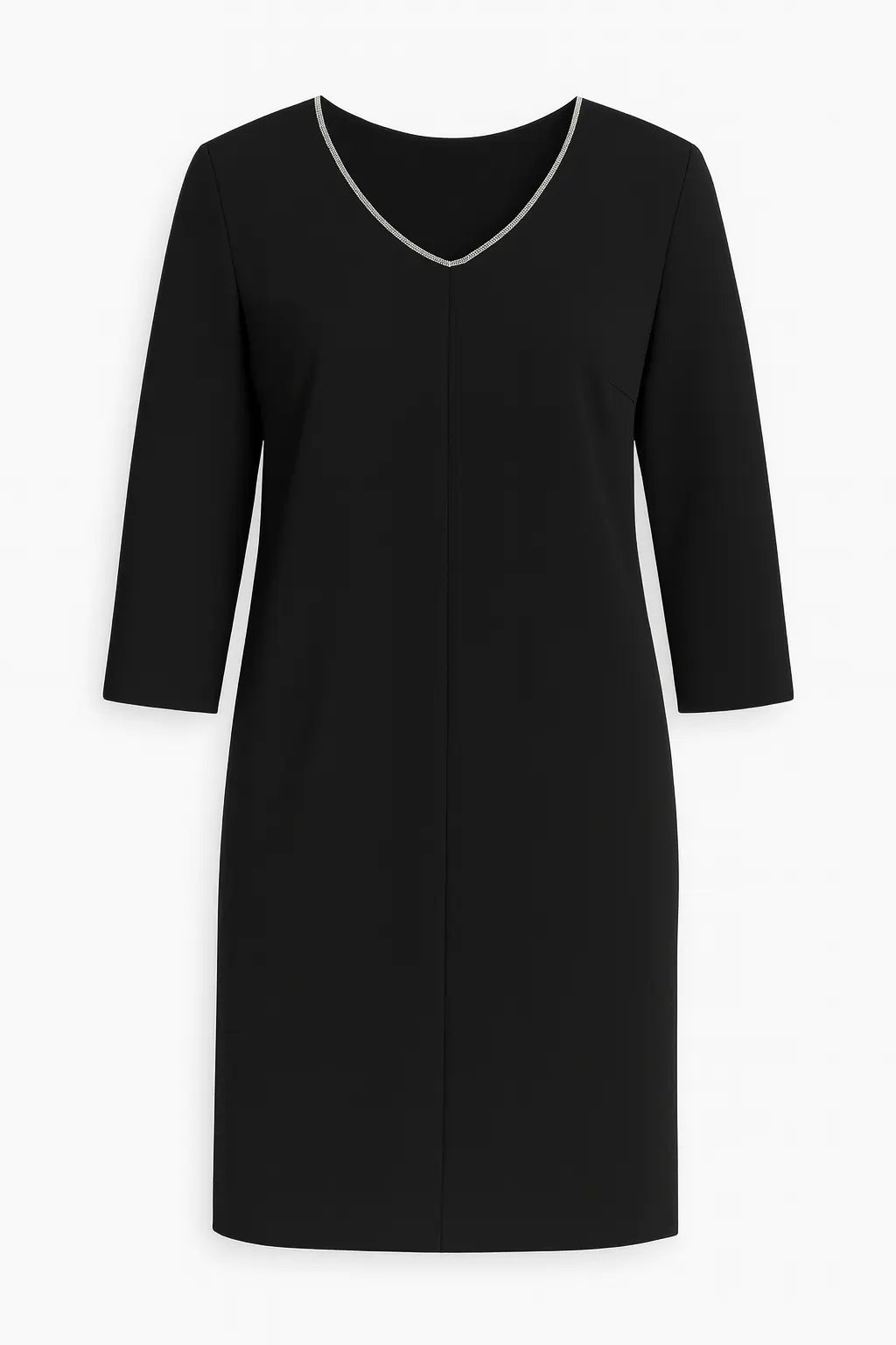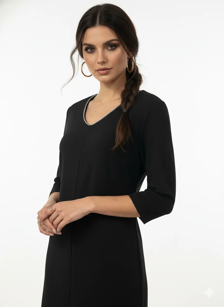 Un abito elegante e intramontabile, perfetto per le occasioni speciali e le serate in cui vuoi distinguerti con semplicità e stile. Lo scollo a V rifinito con dettaglio luminoso aggiunge un tocco sofisticato e femminile, rendendolo ideale per look raffinati e moderni.