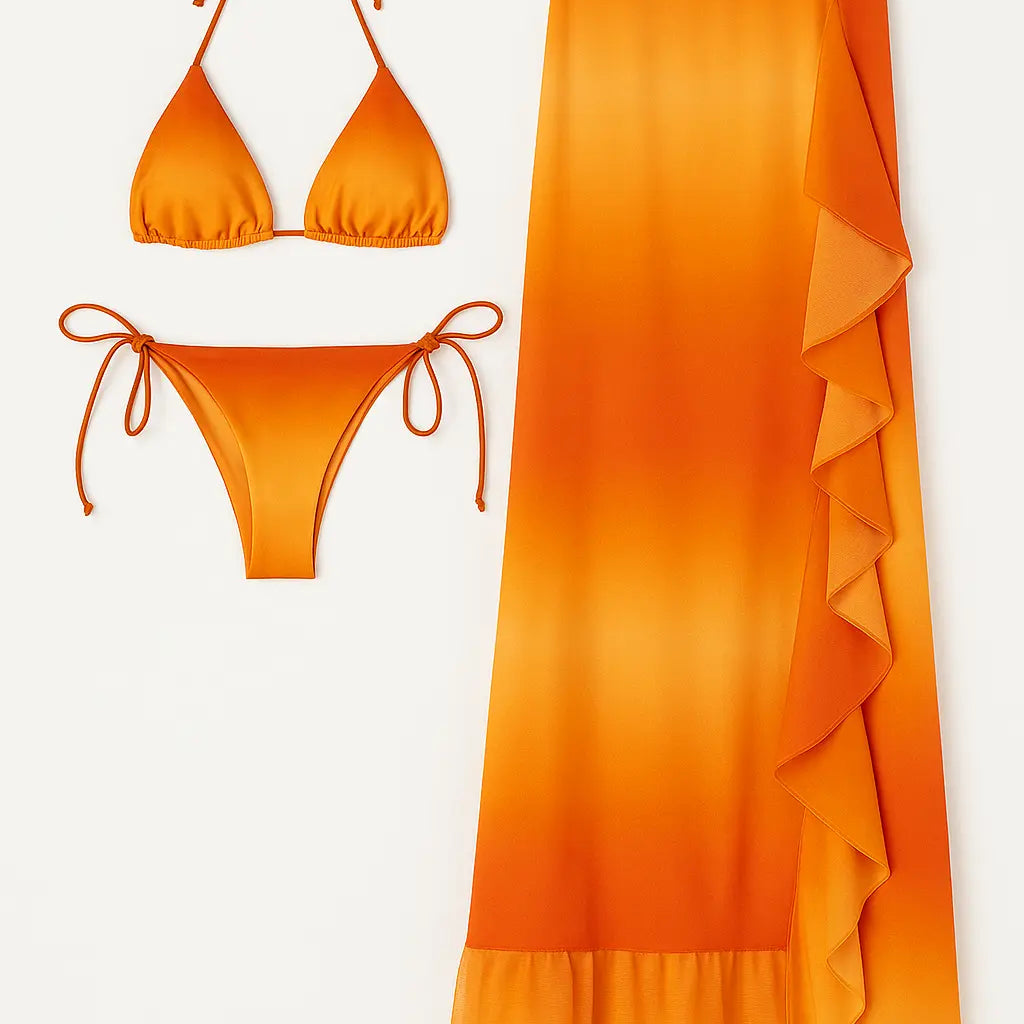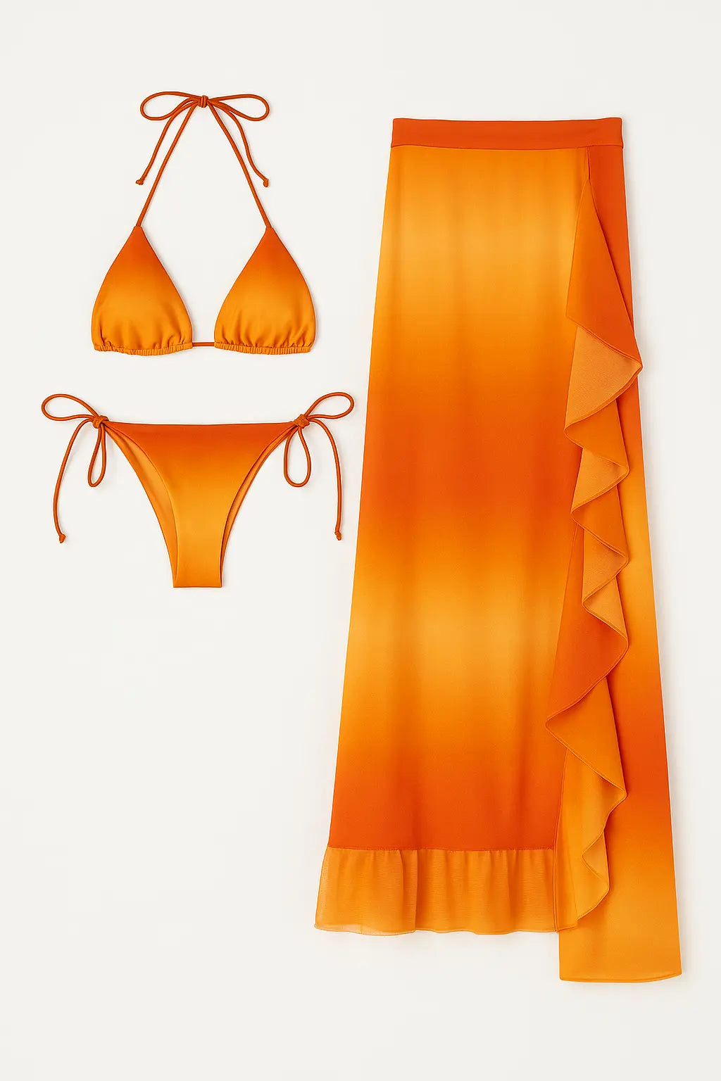 Scopri il perfetto equilibrio tra sensualità e leggerezza con questo set estivo composto da bikini e gonna pareo. Il tessuto satinato del costume incontra la trasparenza impalpabile del voile per un look coordinato che esalta l’abbronzatura e non passa inosservato.