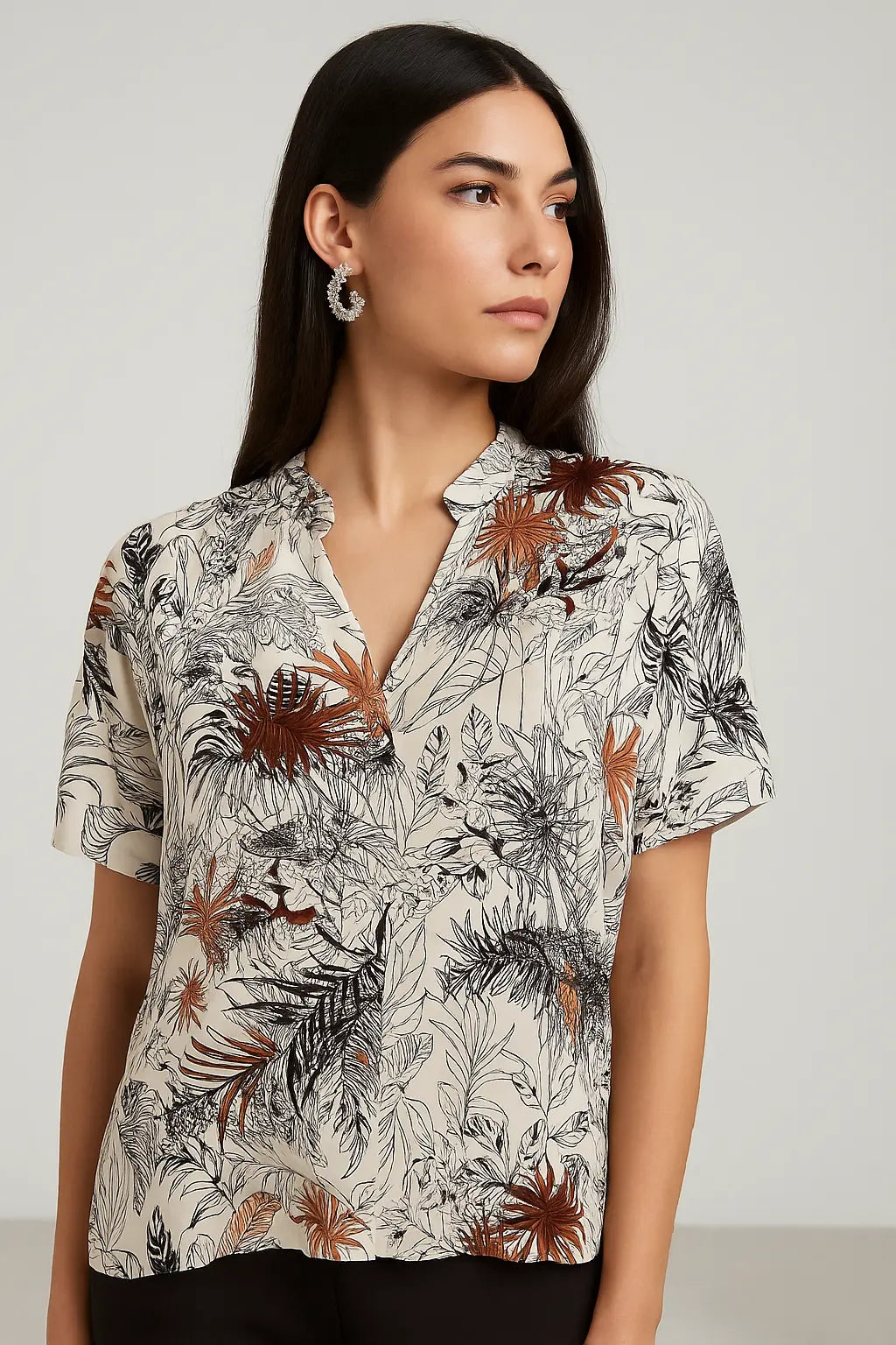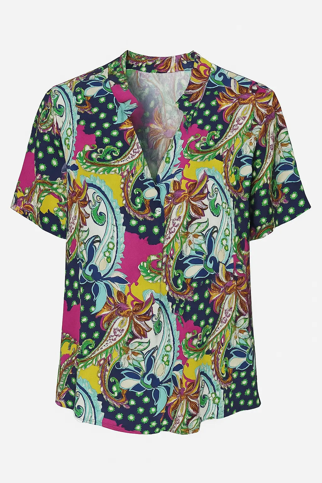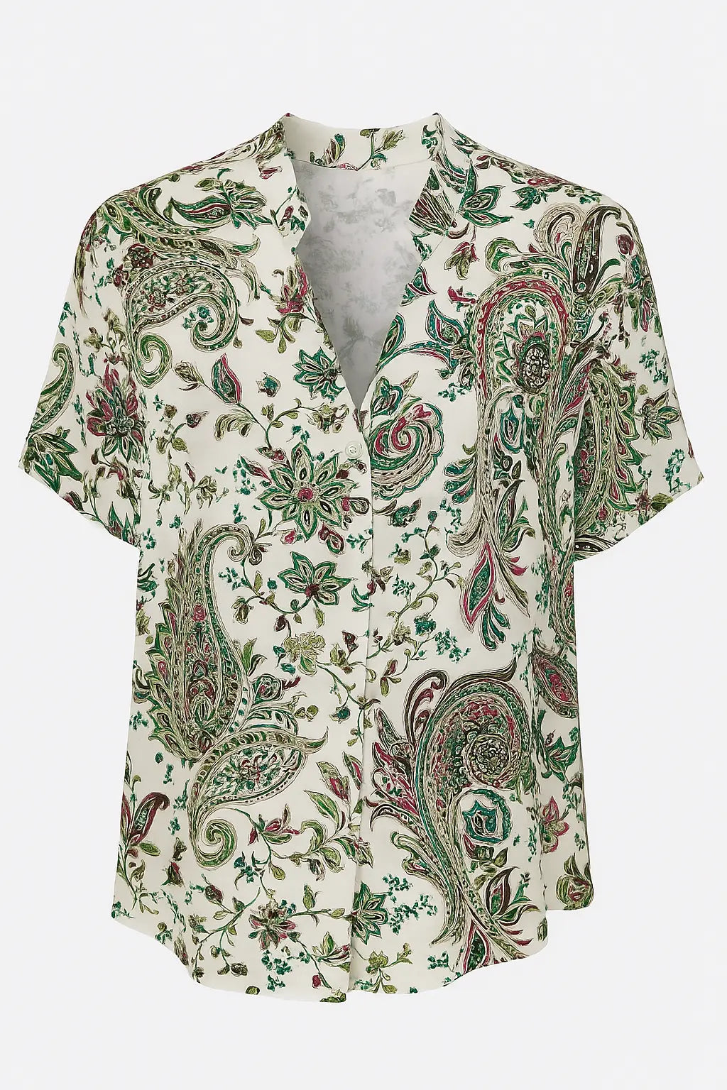 Aggiungi un tocco raffinato e vivace al tuo guardaroba con questa blusa in fluido tessuto di viscosa, ideale per le giornate calde e per outfit eleganti ma confortevoli. Il taglio morbido e il colletto alla coreana donano una silhouette sofisticata, mentre le maniche corte la rendono perfetta per la bella stagione. Disponibile in una varietà di fantasie floreali e paisley, questa camicetta si abbina con facilità a pantaloni, gonne o jeans per creare look versatili, freschi e di tendenza.