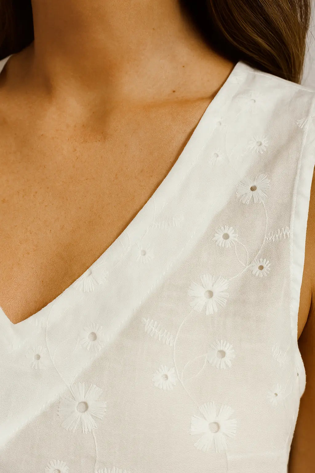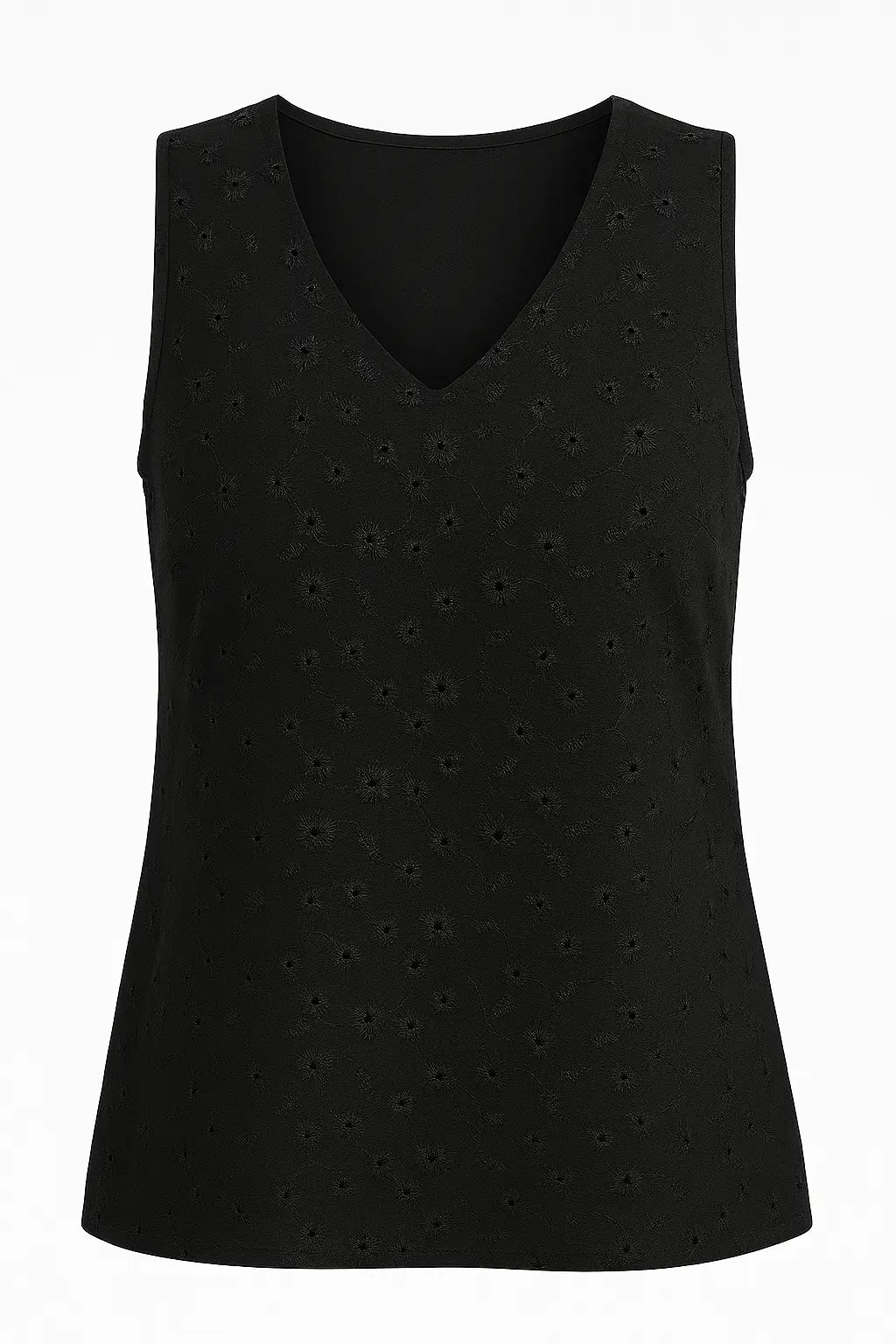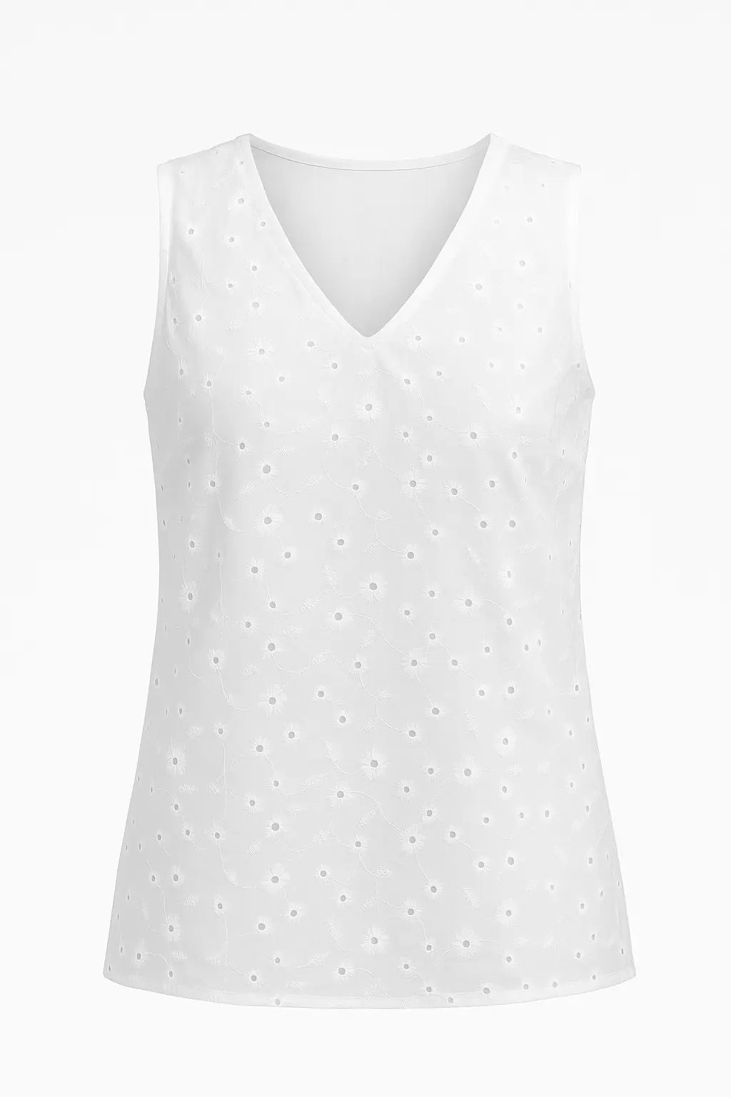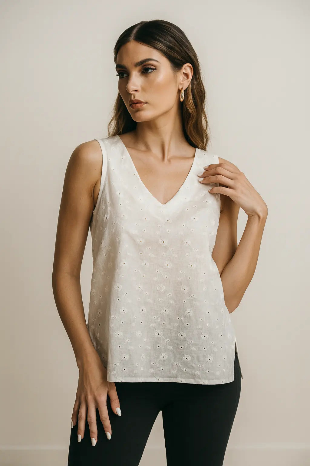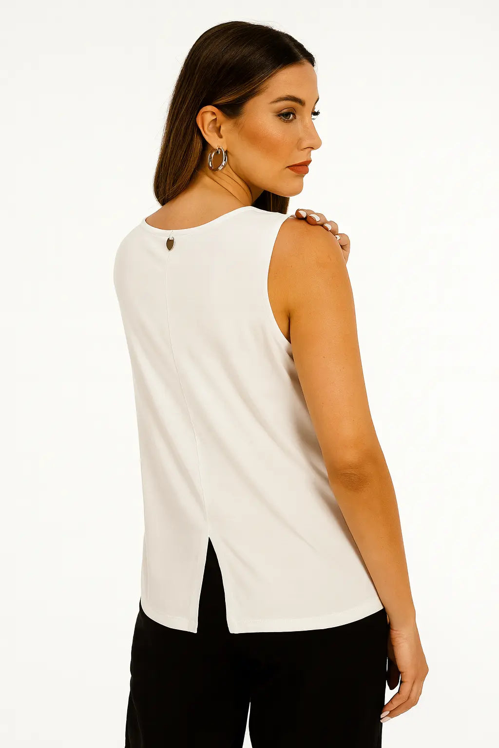 Fresca, romantica e femminile, questa canotta bianca è la scelta perfetta per completare i tuoi outfit estivi. Il davanti in tessuto sangallo regala un tocco raffinato e artigianale, con delicati motivi floreali ricamati su una base leggera e traspirante. Il retro in jersey di viscosa stretch garantisce il massimo comfort e una vestibilità perfetta, mentre lo spacco posteriore aggiunge movimento e modernità. Indossala con un pantalone palazzo o una gonna midi per un look casual-chic impeccabile.