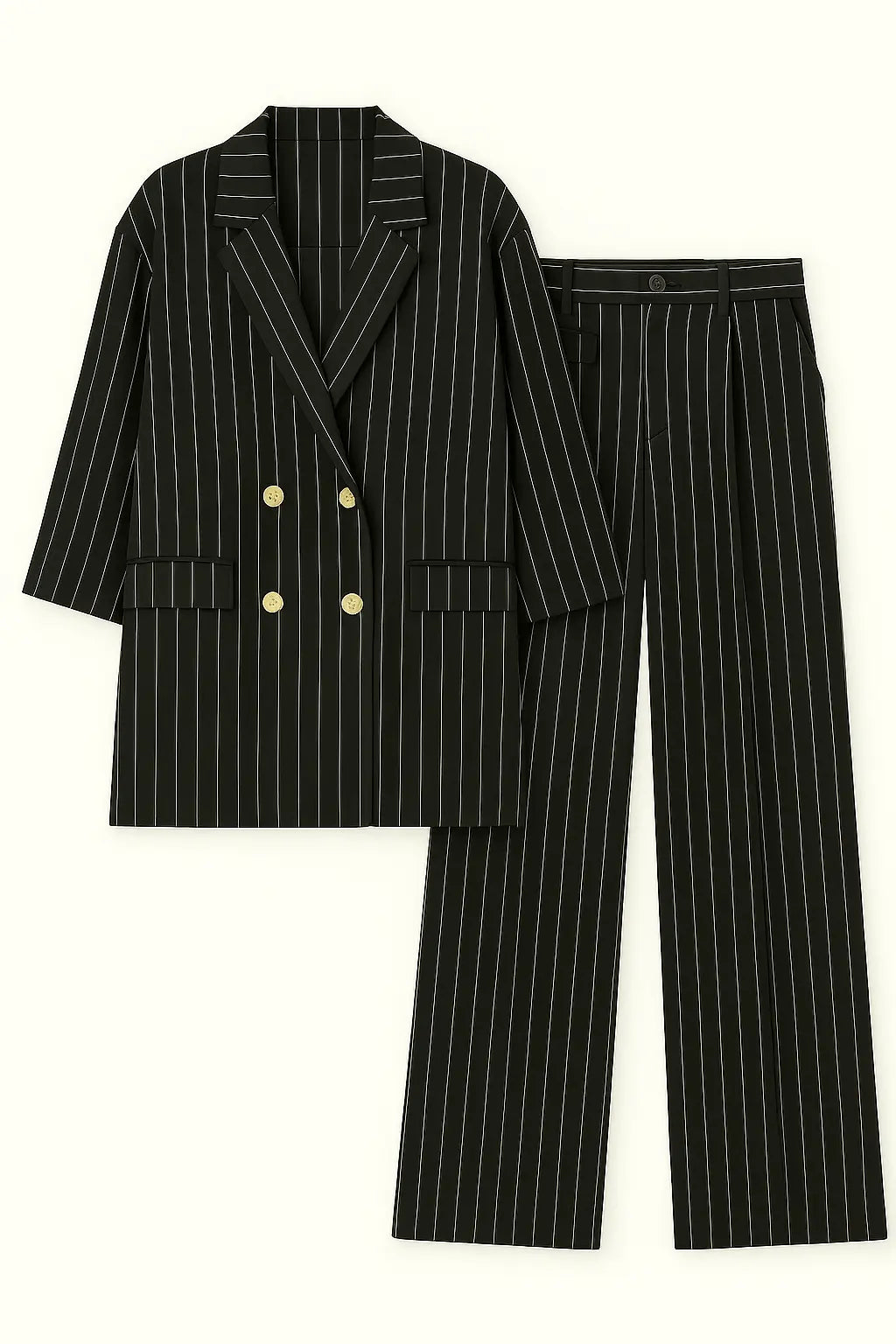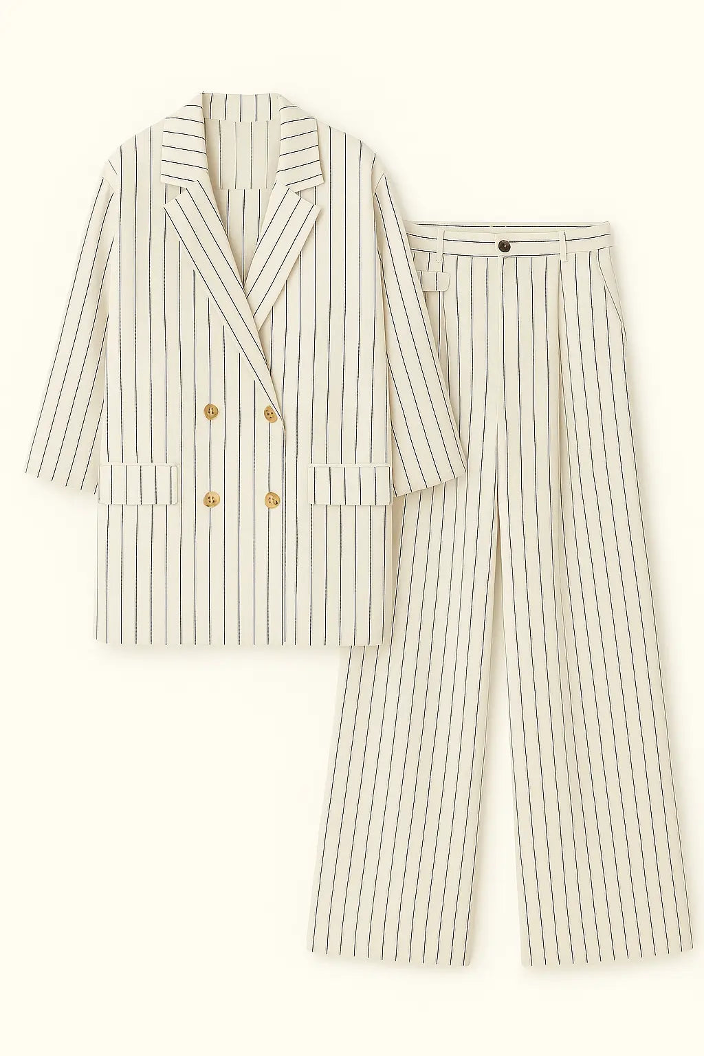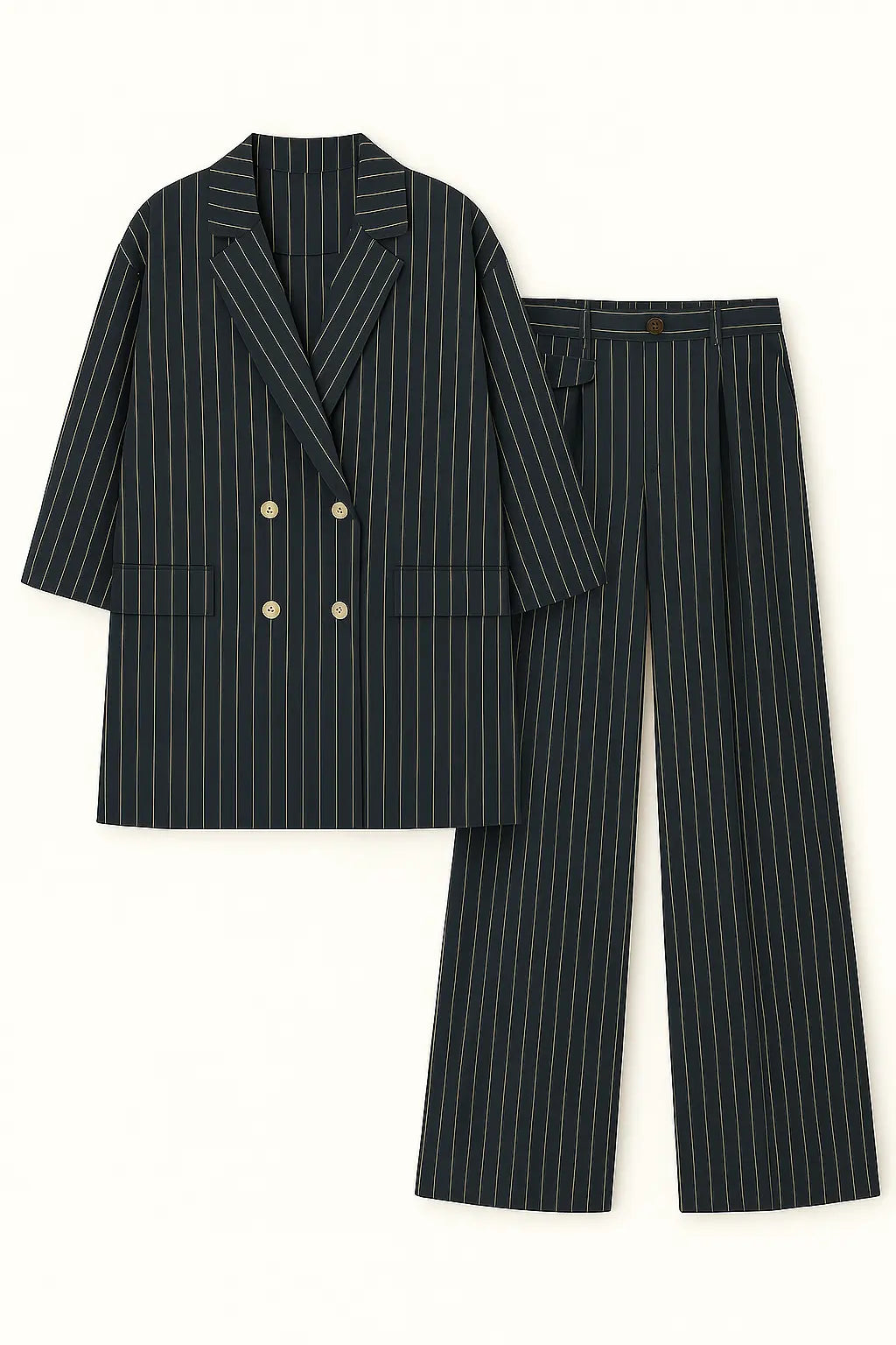 Sofisticato e contemporaneo, questo completo gessato a righe verticali è la scelta perfetta per un look da ufficio dal gusto moderno o per eventi formali con un twist fashion. Composto da una giacca doppiopetto dal taglio morbido con rever classico e maniche arrotolate, e da un pantalone ampio a vita alta con pince frontali, questo set garantisce comfort ed eleganza in un solo gesto. Le righe verticali slanciano la figura, mentre il tessuto leggero rende il completo perfetto anche per la stagione primaverile ed estiva.