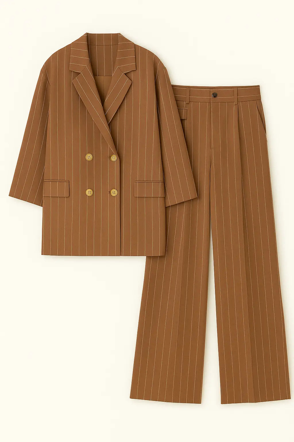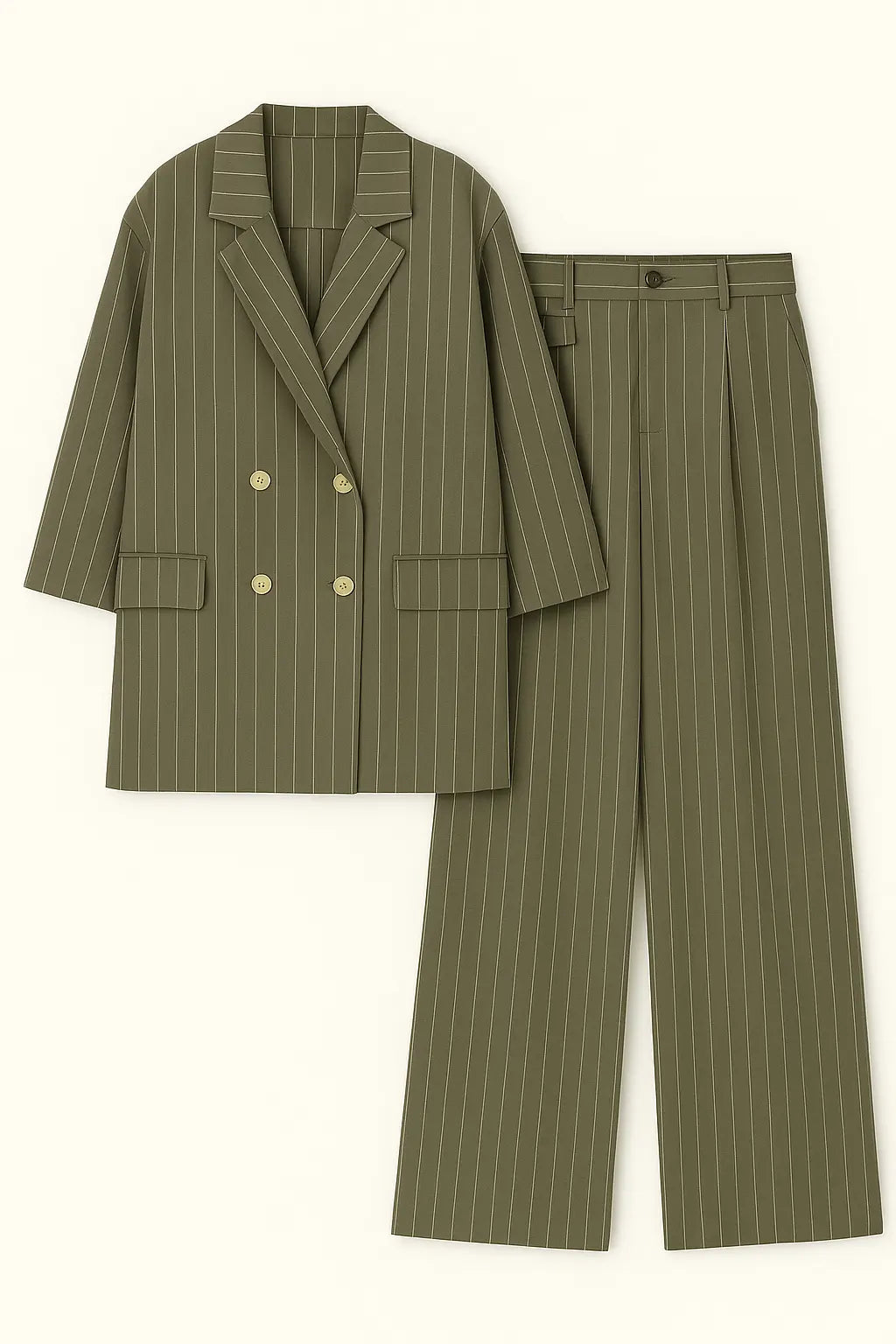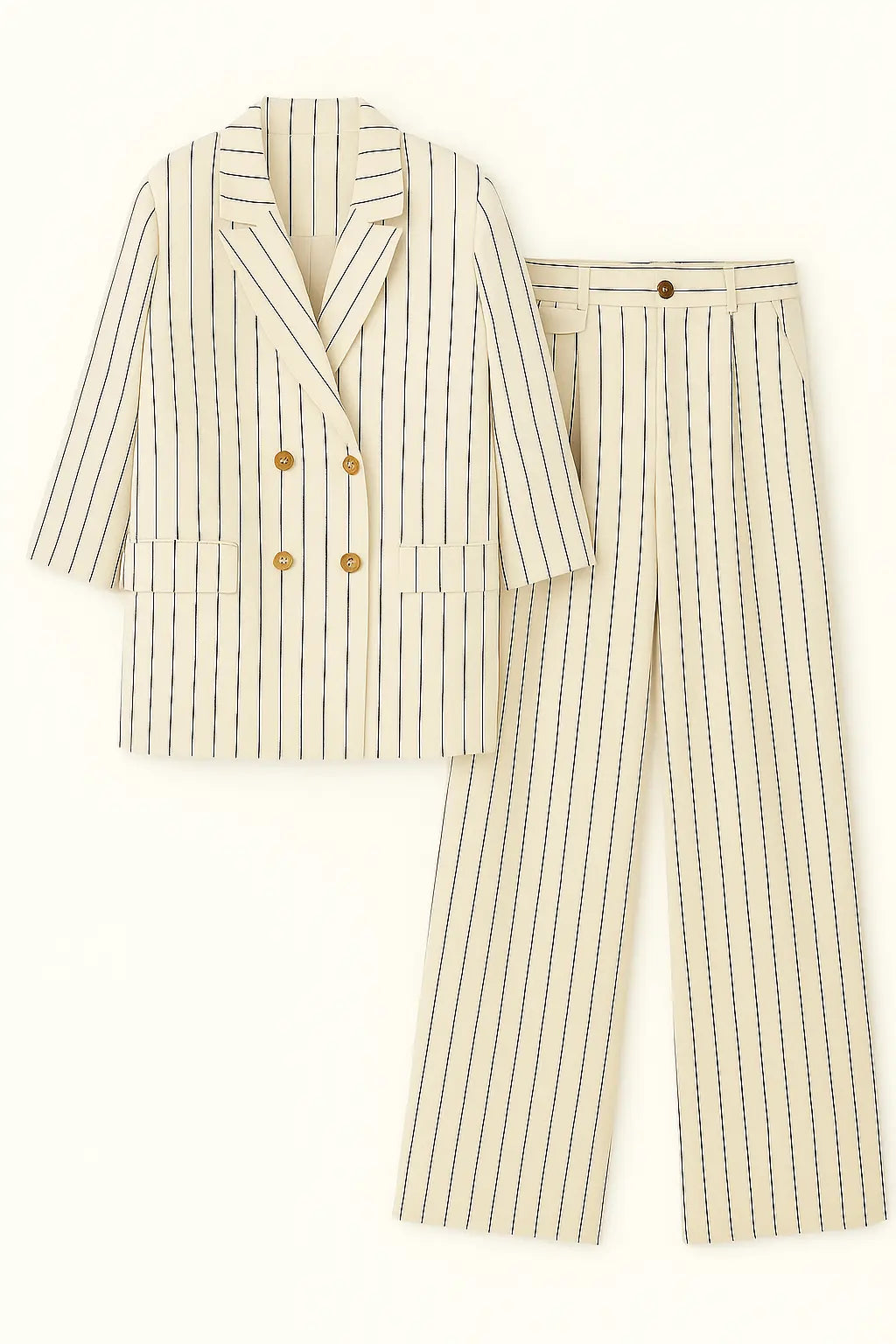 Sofisticato e contemporaneo, questo completo gessato a righe verticali è la scelta perfetta per un look da ufficio dal gusto moderno o per eventi formali con un twist fashion. Composto da una giacca doppiopetto dal taglio morbido con rever classico e maniche arrotolate, e da un pantalone ampio a vita alta con pince frontali, questo set garantisce comfort ed eleganza in un solo gesto. Le righe verticali slanciano la figura, mentre il tessuto leggero rende il completo perfetto anche per la stagione primaverile ed estiva.