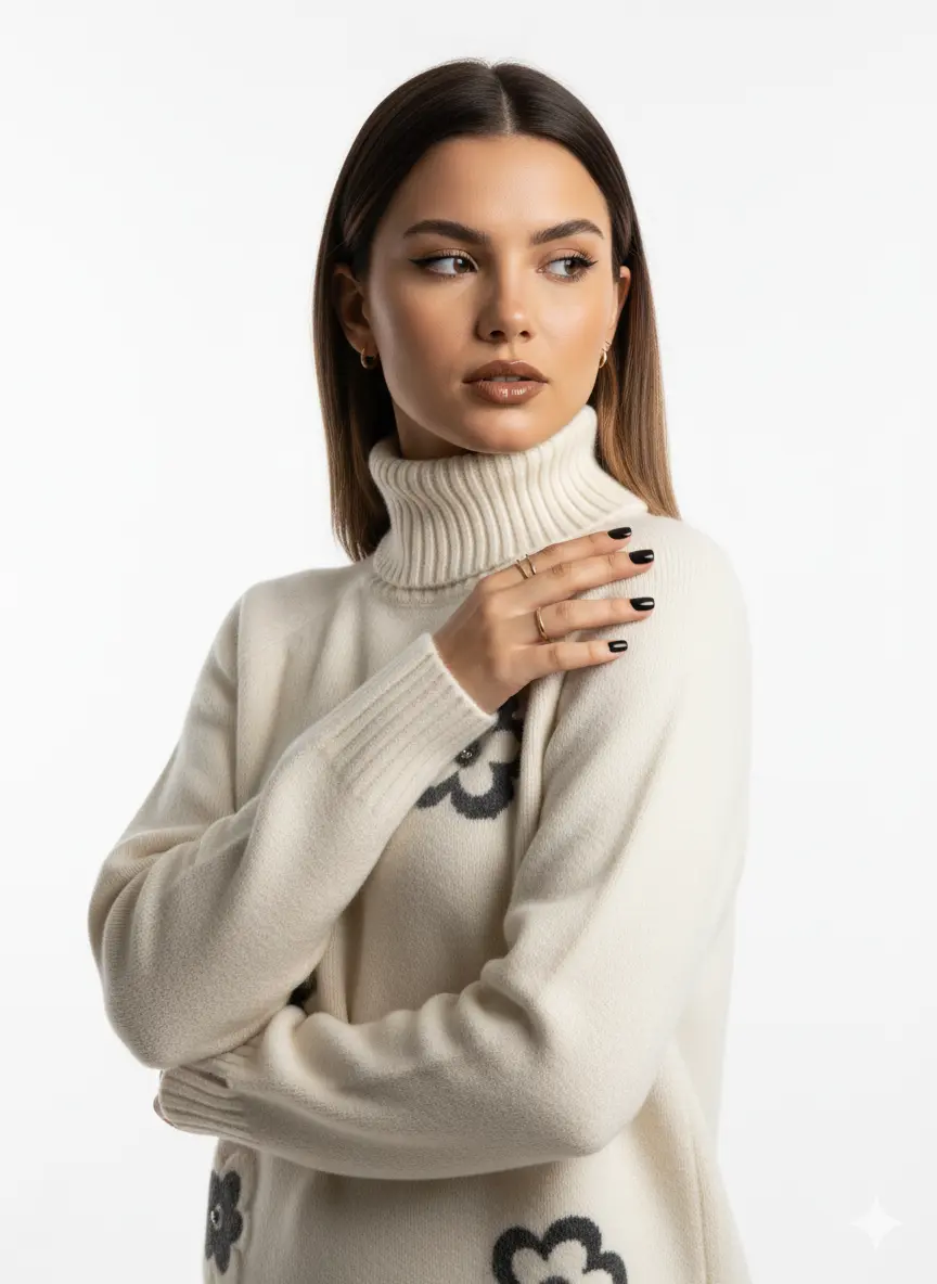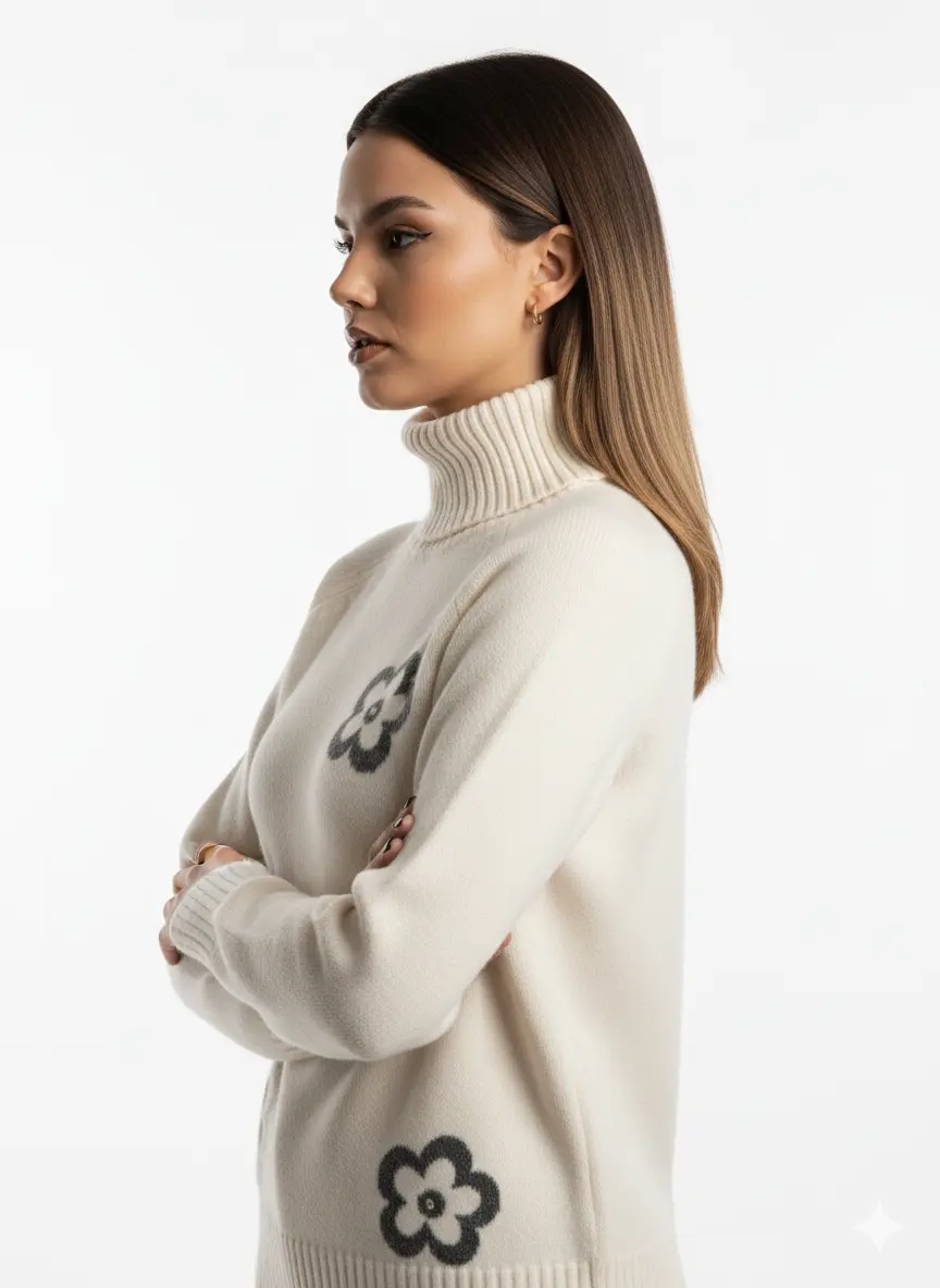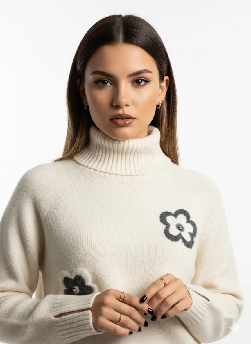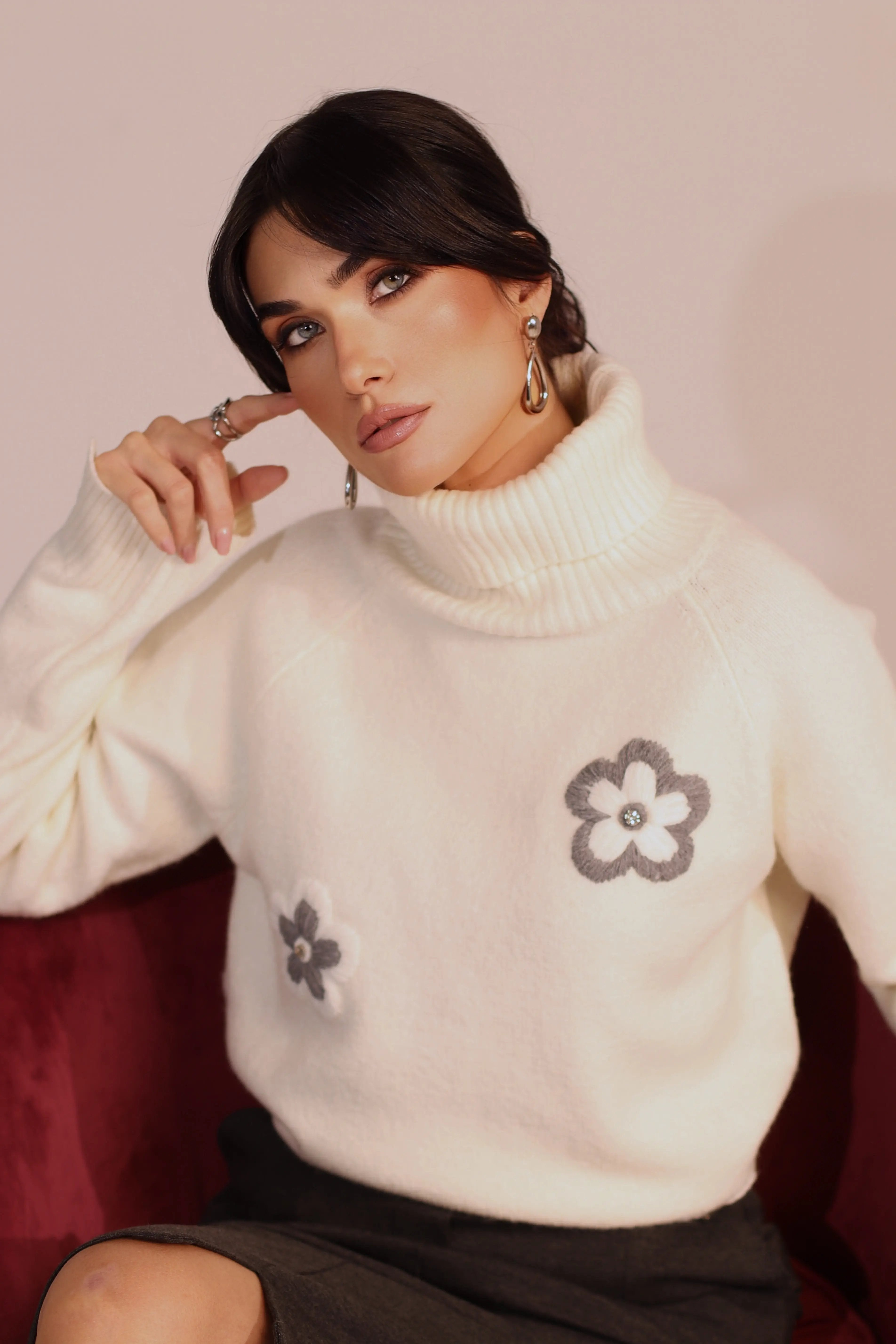 Questo maglione con collo alto a costine è impreziosito da ricami floreali in rilievo con piccoli dettagli gioiello al centro, che aggiungono luce e femminilità al look.