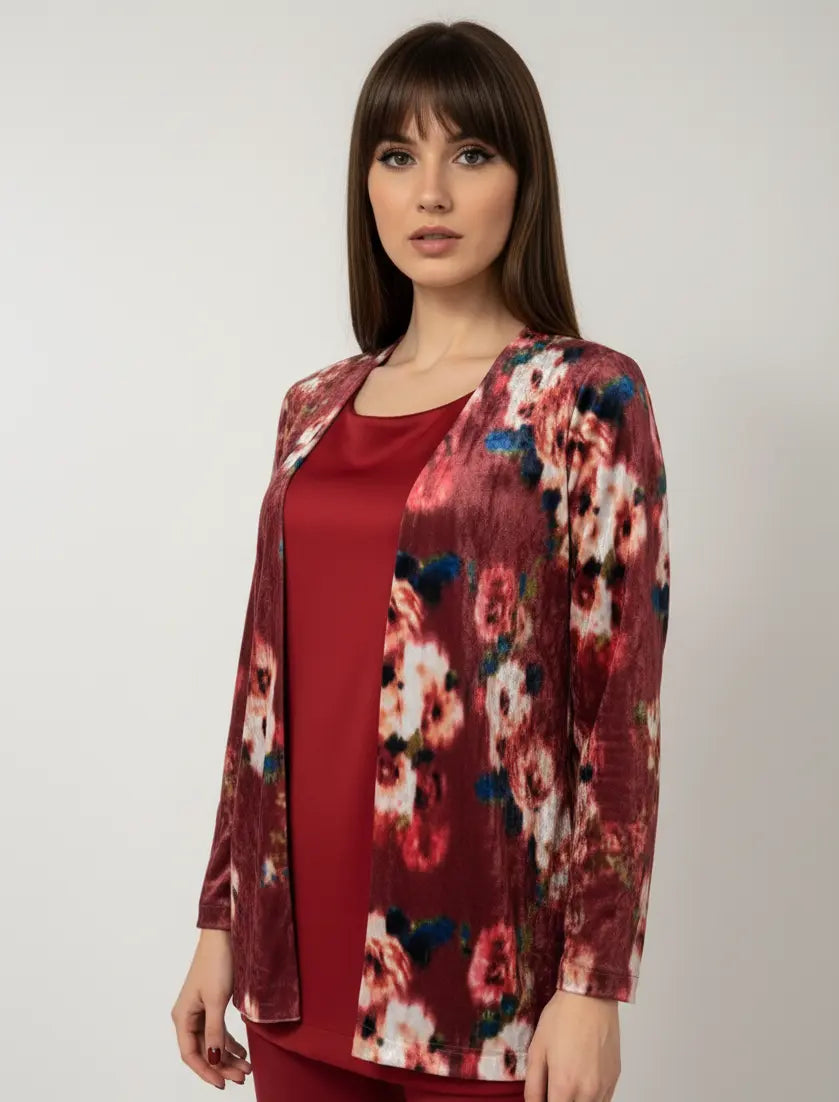 La fantasia floreale dai toni bordeaux, rossi e accesi illumina il look, mentre la base tinta unita sottostante crea equilibrio e armonia. Un capo versatile, ideale per outfit da giorno e da sera.