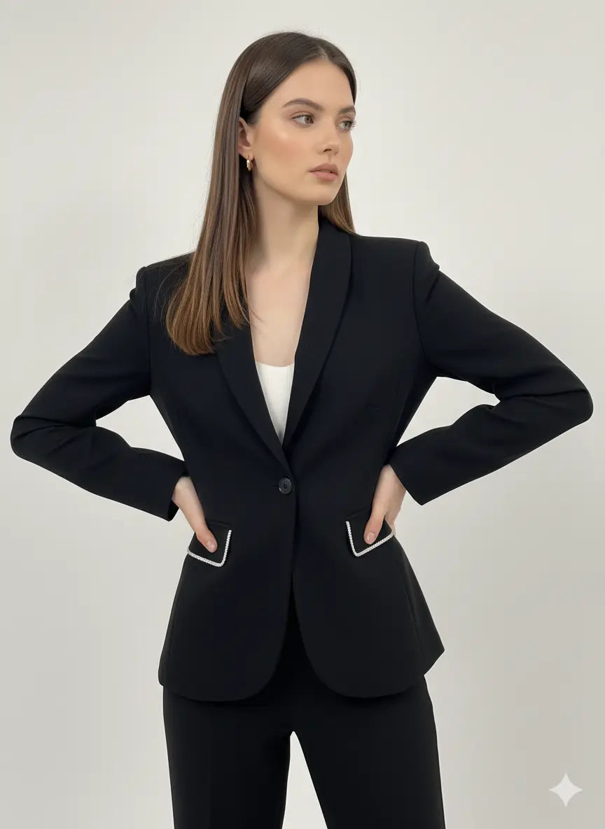 Un capo intramontabile che unisce la linea pulita della giacca monopetto con un dettaglio scintillante che fa la differenza: i profili tasche decorati da luminosi strass. Perfetta per look da cerimonia, eventi speciali o per dare un tocco glamour anche all’outfit da ufficio.
