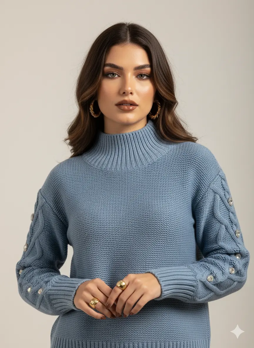 Questo maglione in filato morbido è caratterizzato da maniche a treccia impreziosite da bottoni gioiello che catturano la luce con discreta eleganza.