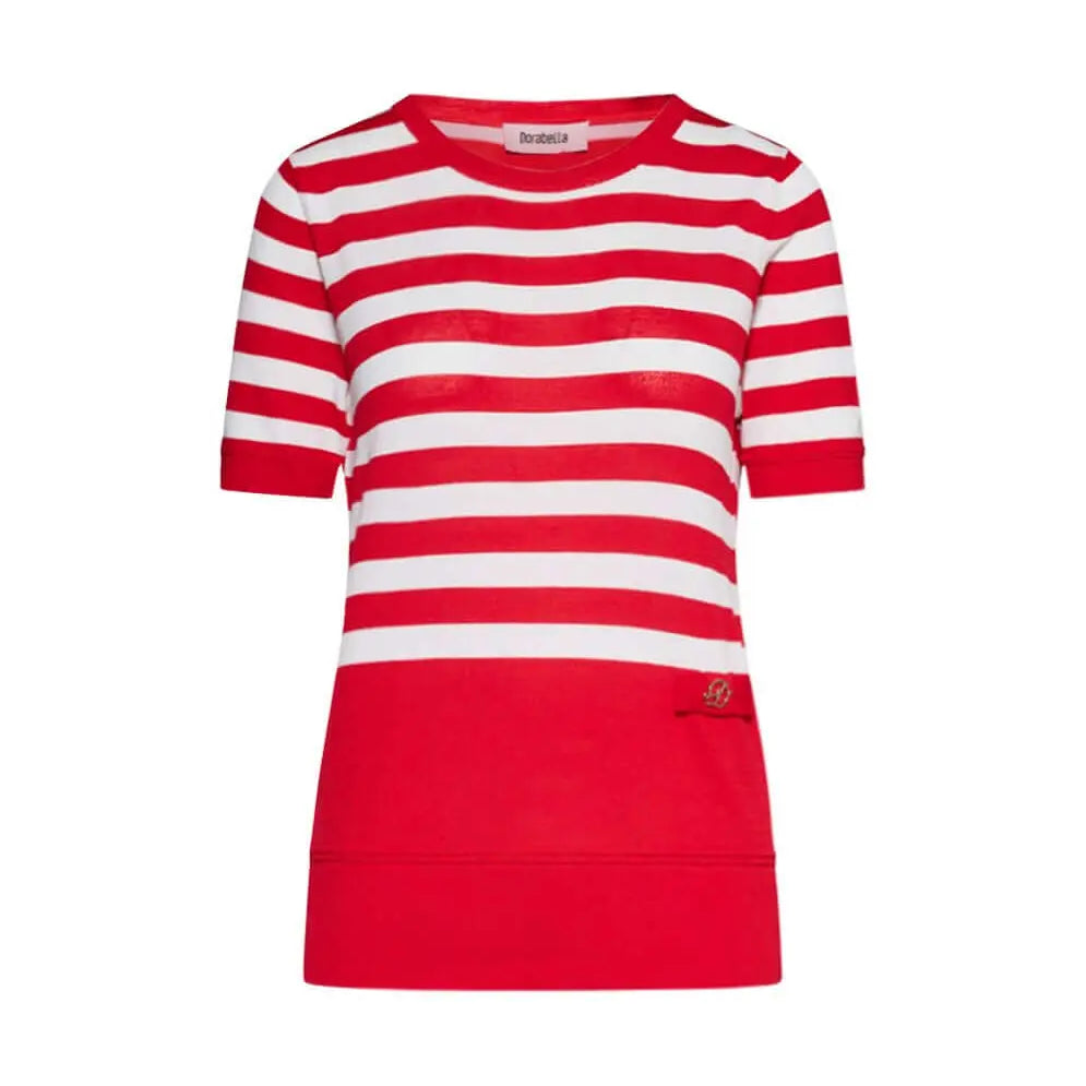 Suéter con estampado de rayas, cuello redondo, manga corta, con detalle de lazo frontal adornado con el medallón del logo de Dorabella.