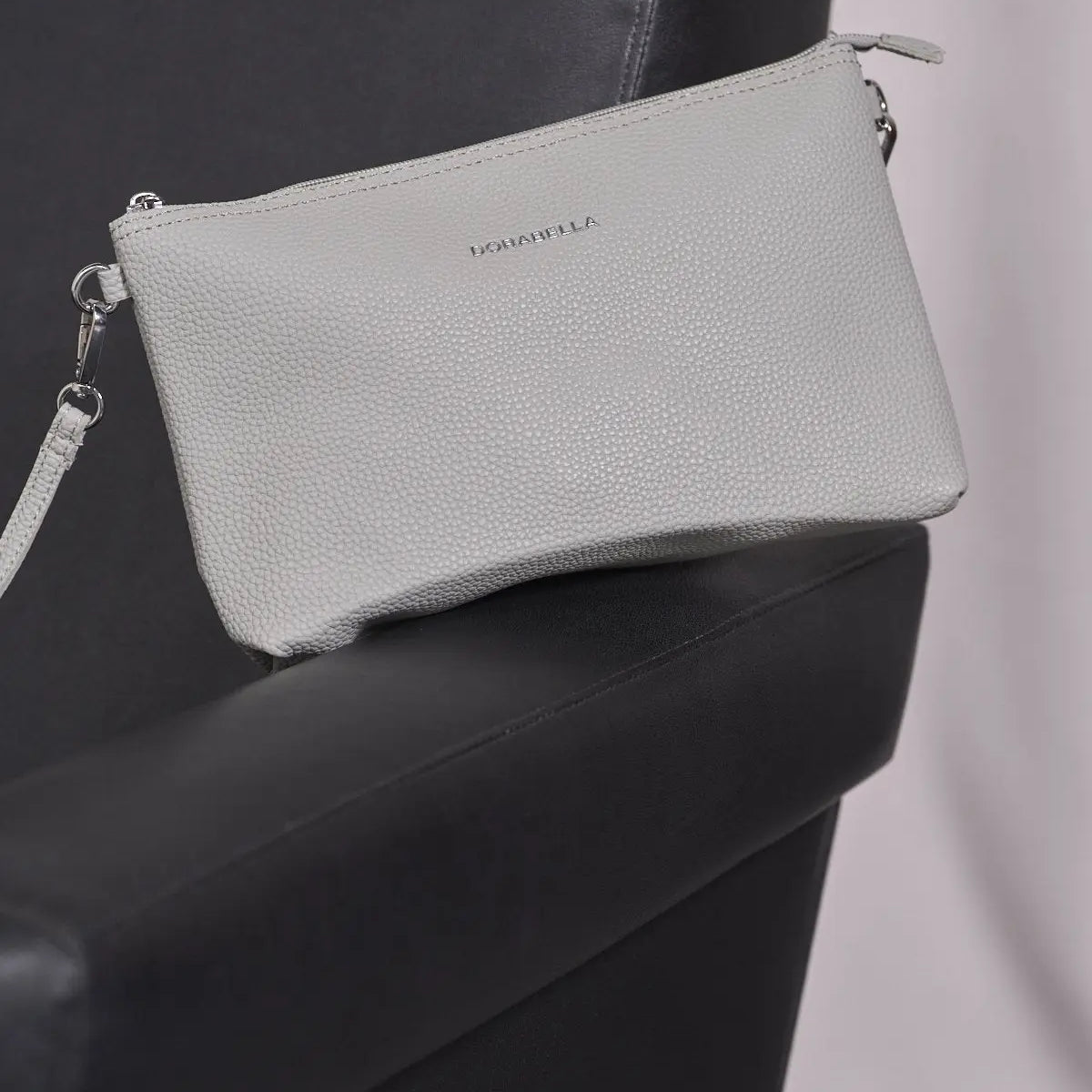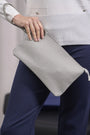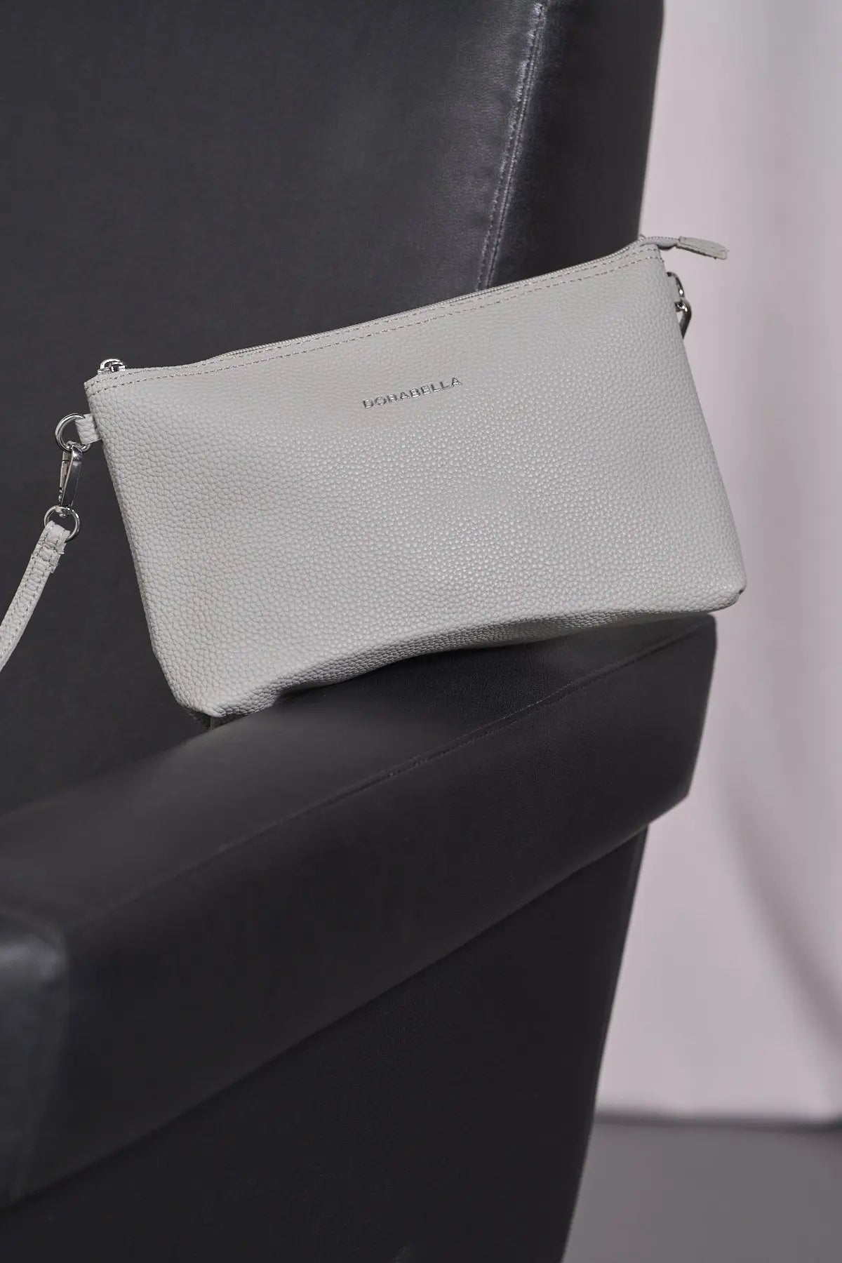 Clutch de piel ecológica granulada con logo en la parte delantera y correa de muñeca GRIS PERLA