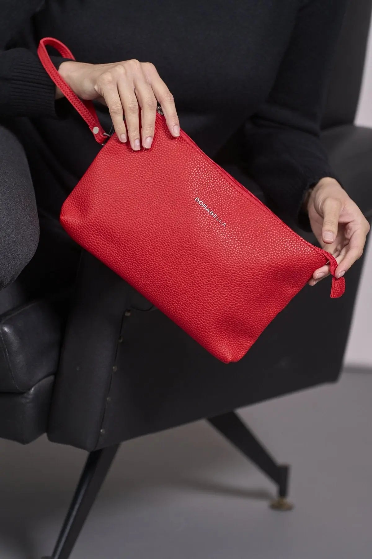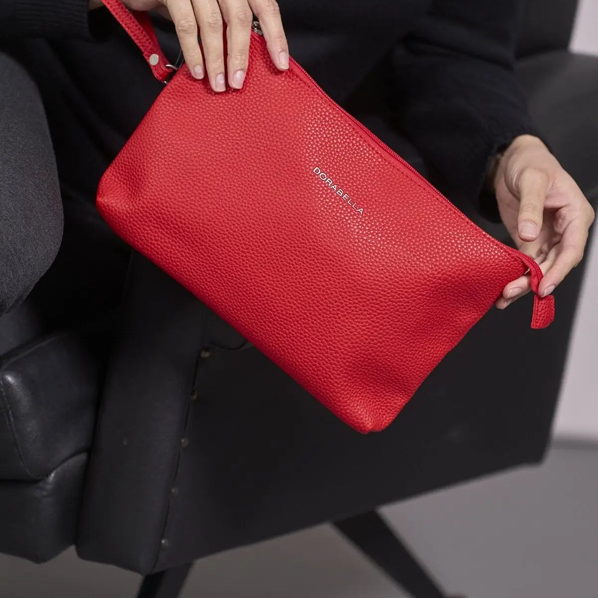 Clutch de piel ecológica granulada con logo en la parte delantera y correa de muñeca RIBES