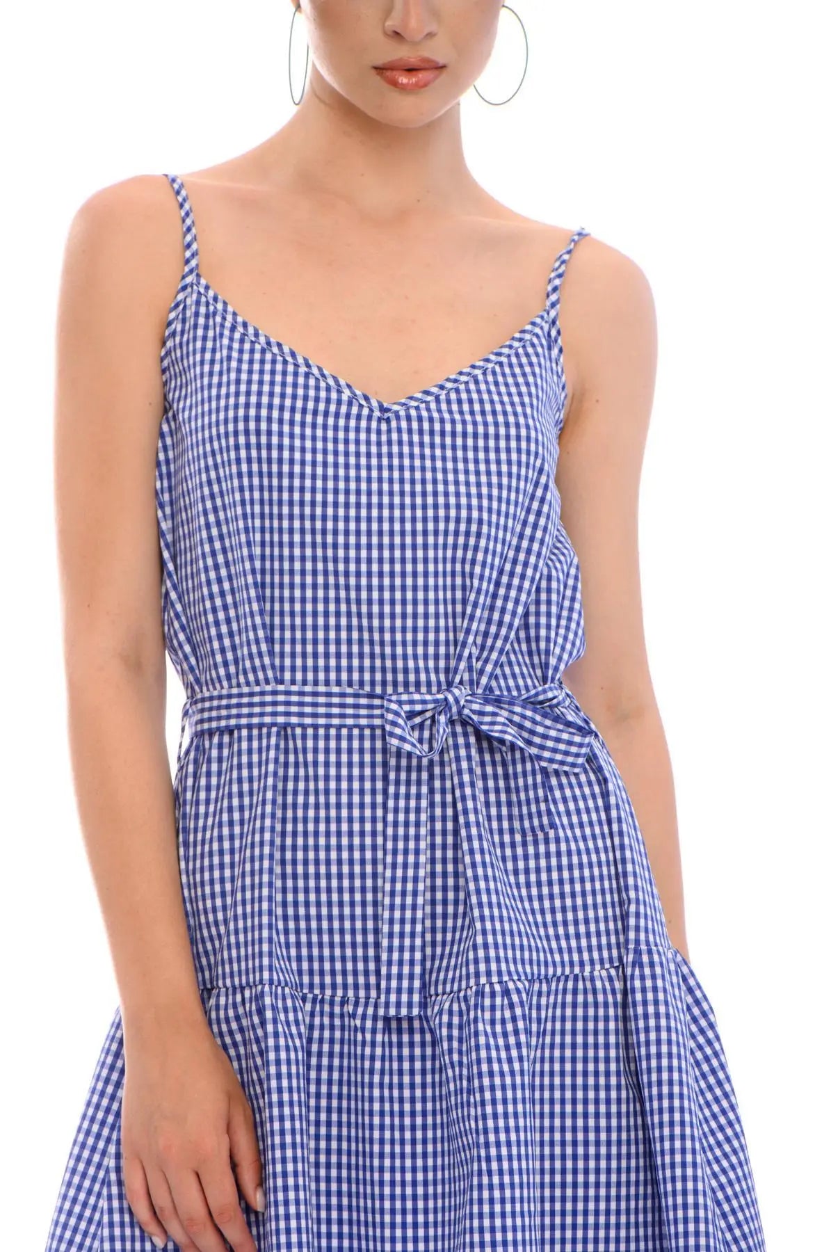 Vestido de escote en pico con estampado geométrico y nudo ajustable en la cintura.