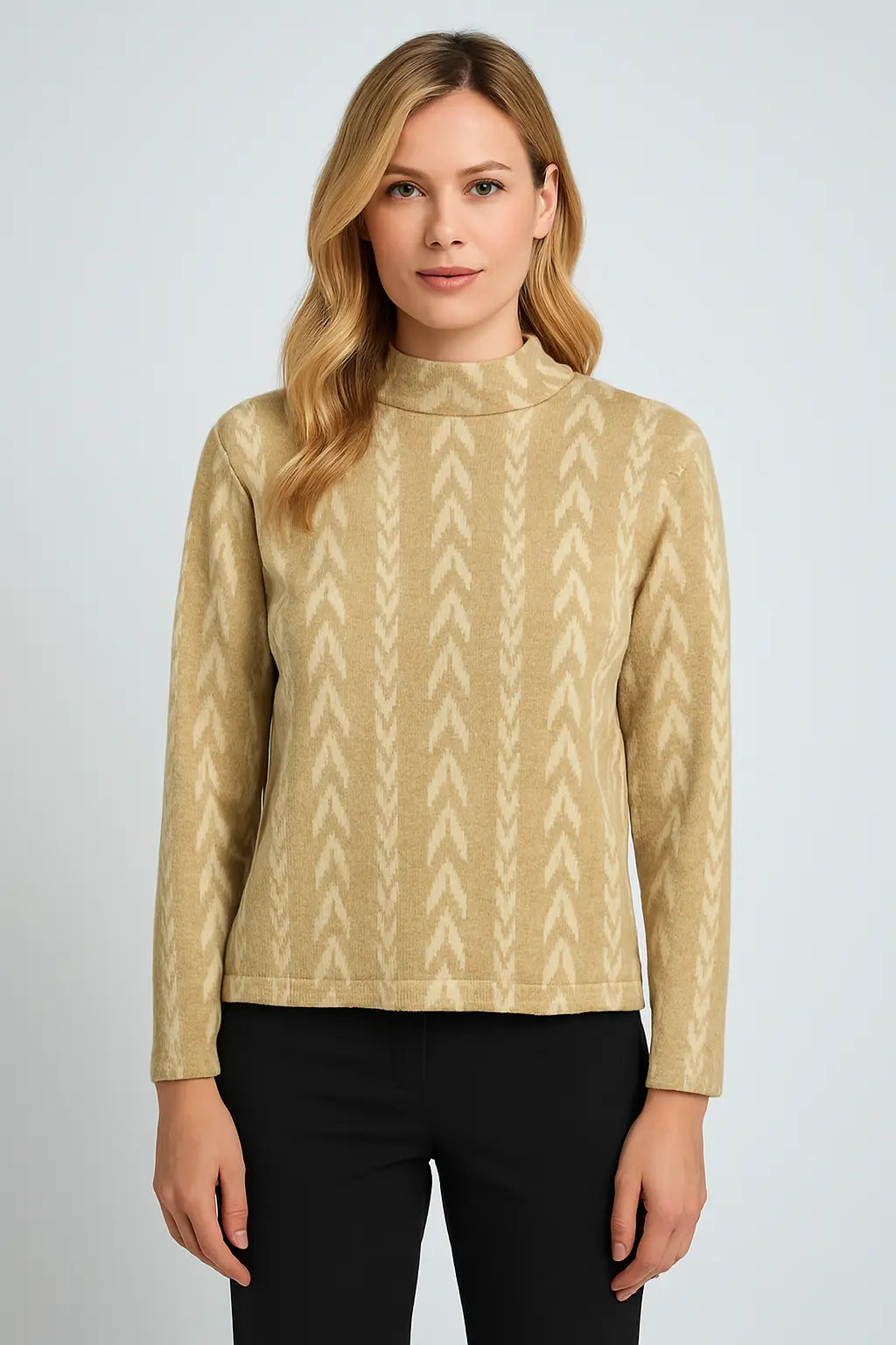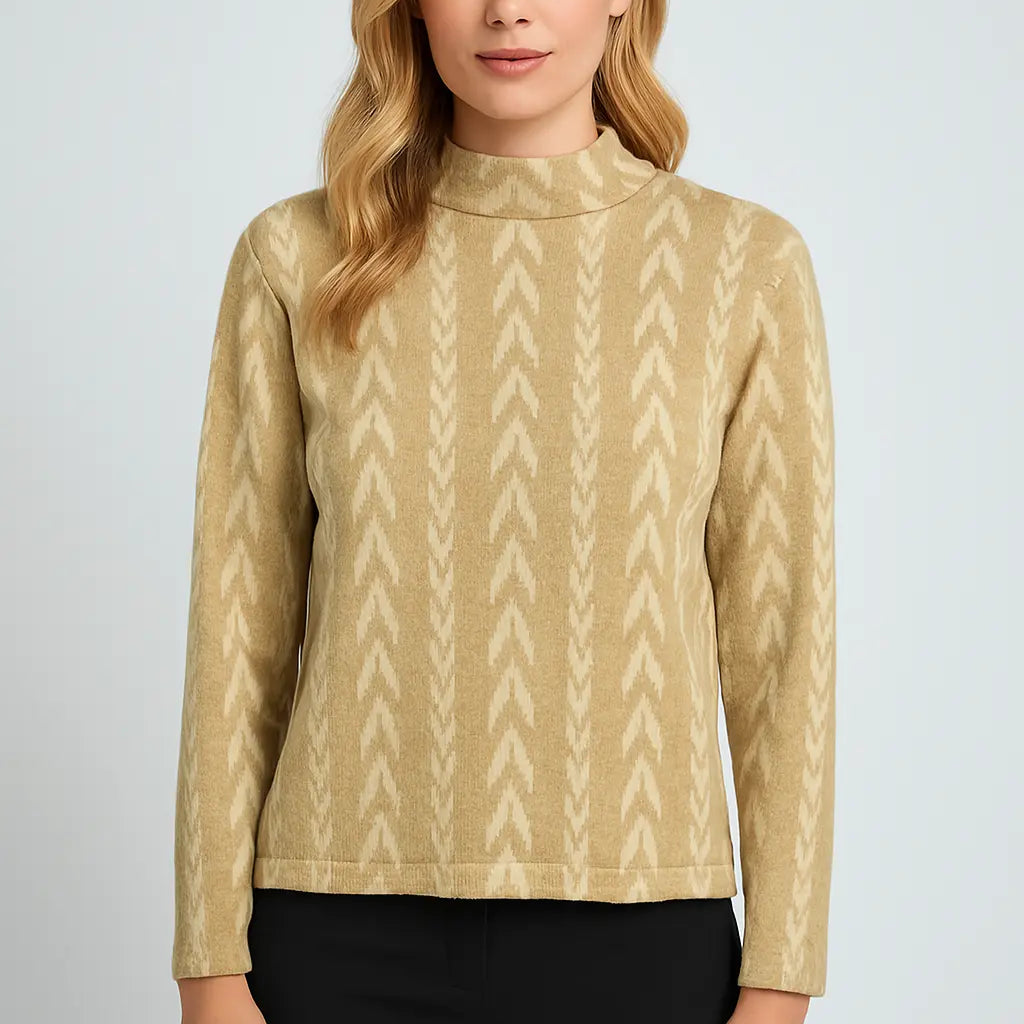 Maglia morbida in filato beige con motivo chevron e collo alto. Vestibilità comoda e chic, perfetta per look eleganti e casual.