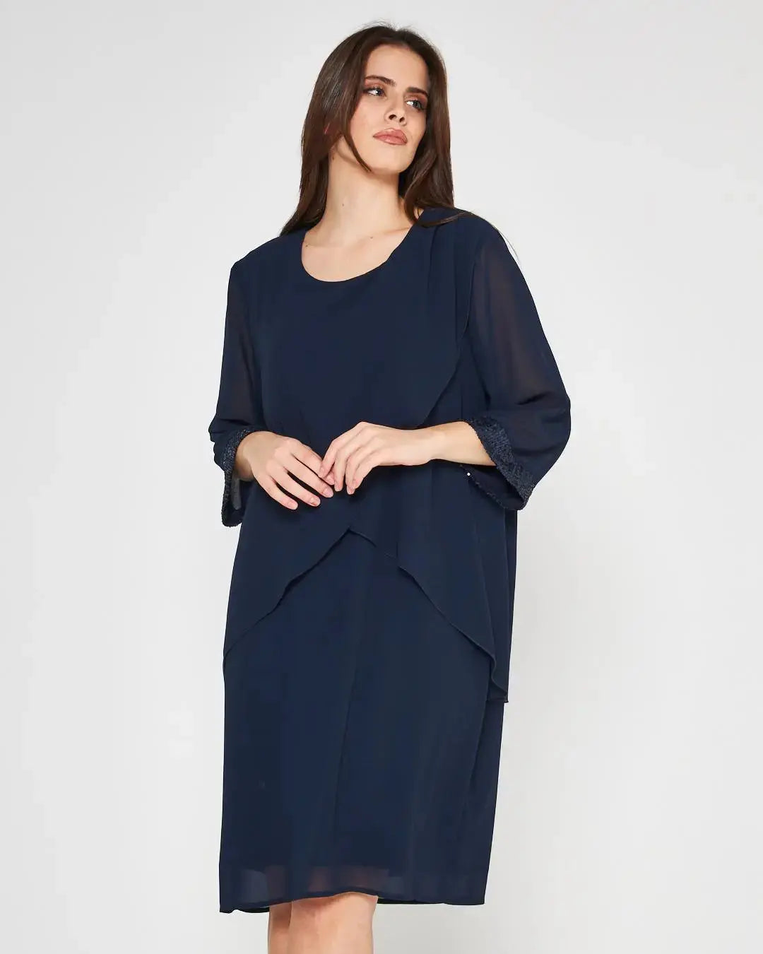 Vestido con mangas 3/4, bajo de manga con lentejuelas y volantes de georgette. Logotipo de corazón en la parte posterior. Ajuste regular