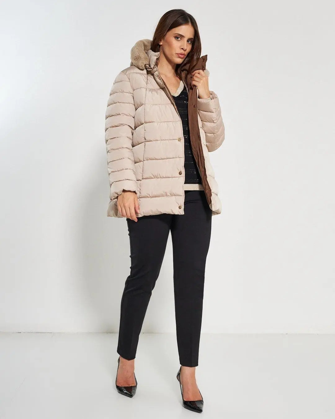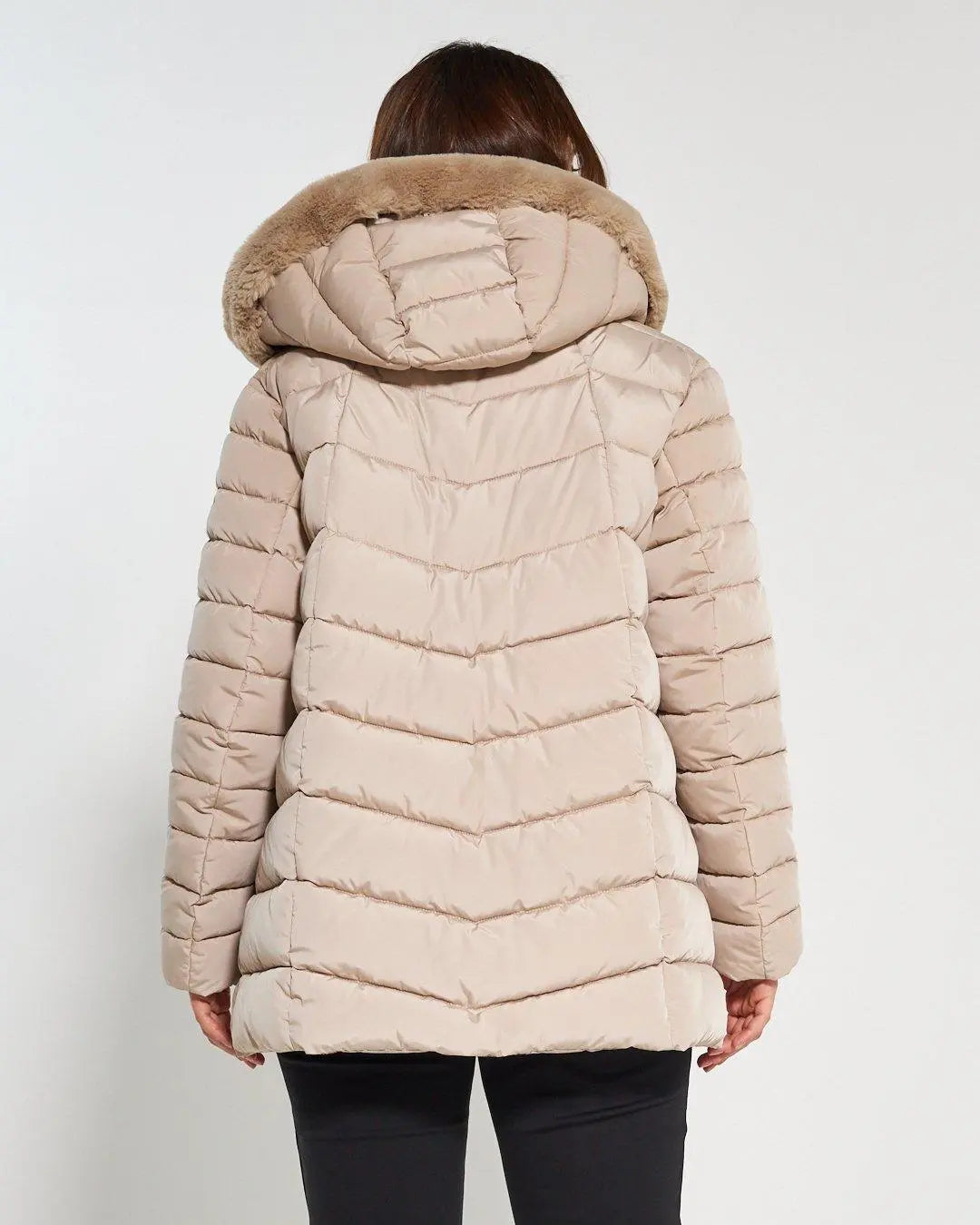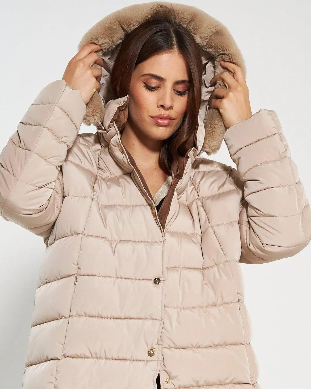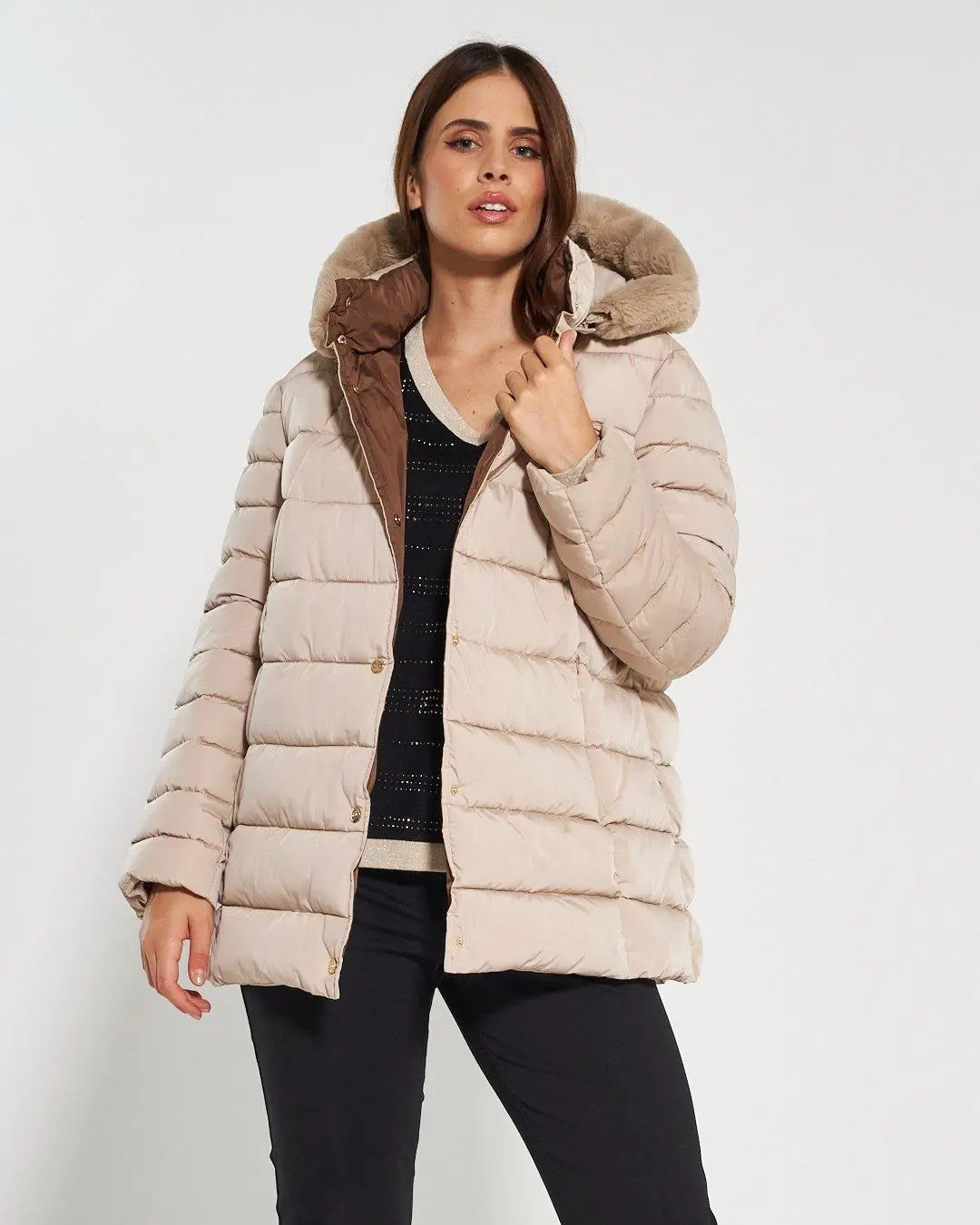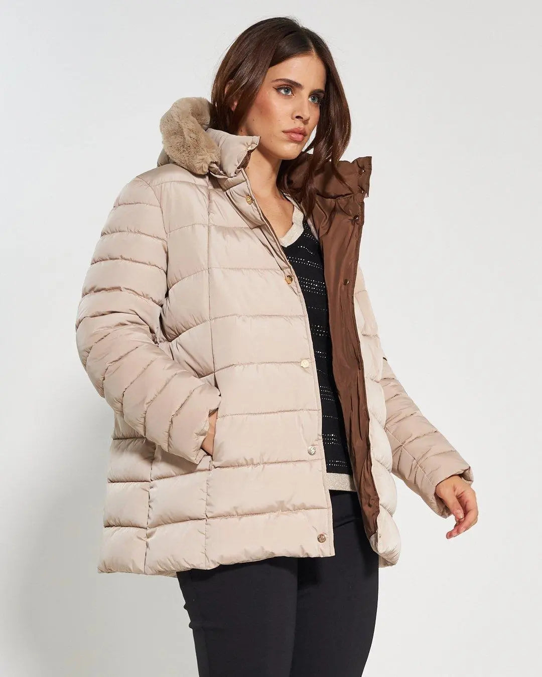 Chaqueta acolchada 3/4 con capucha desmontable. Acolchado con costuras horizontales y bolsillos invisibles. Botones a presión y para completar la prenda un suave ribete de pelo en el mismo tono enmarca la capucha. Etiqueta con el logotipo del corazón