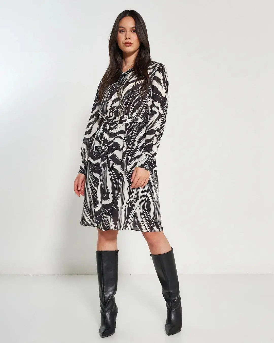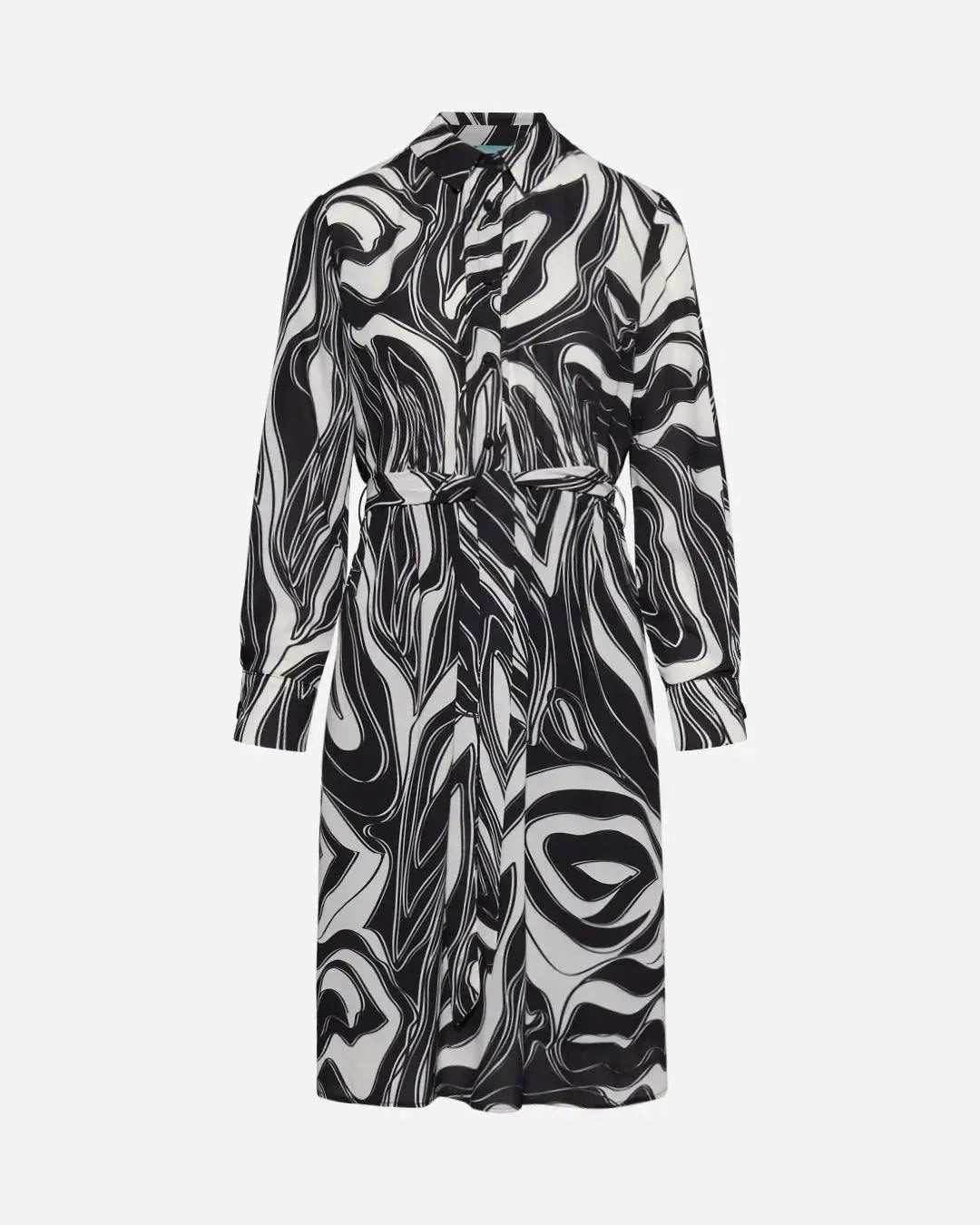 Vestido en triple georgette con estampado abstracto; Cuello y botones a juego con corte de cintura; la manga abullonada con puño alto y botones; cinturón de tela. La prenda es elegante y chic, adecuada para cualquier evento. Etiqueta con el logotipo del corazón colocada detrás del cuello