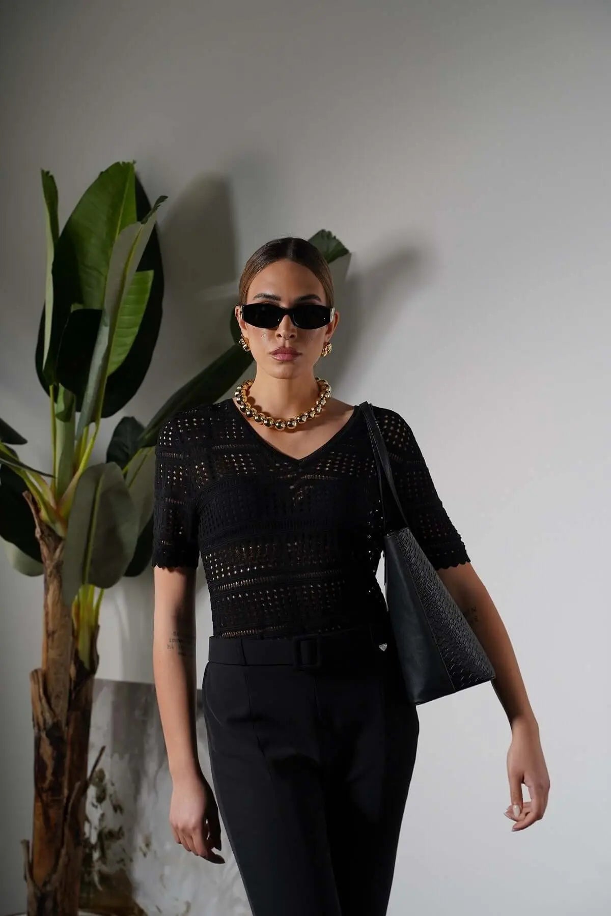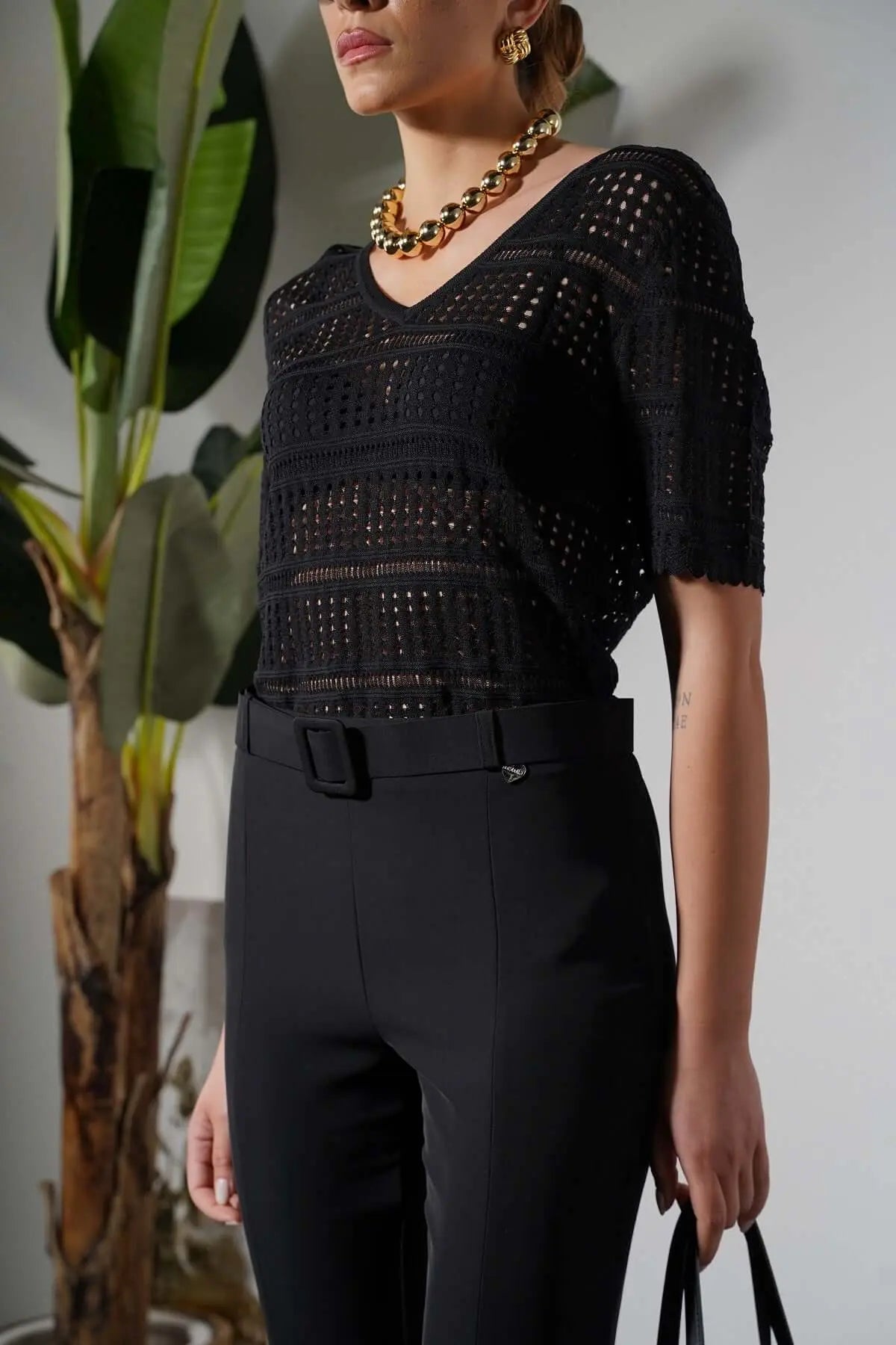 Suéter de cuello pico en punto pointelle calado de mezcla de viscosa. NEGRO