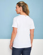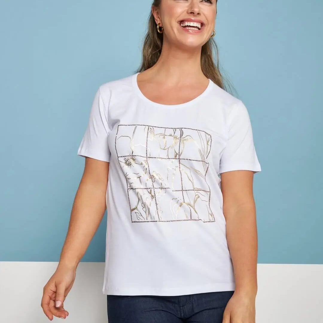 Camiseta de jersey de algodón elástico con estampado y pedrería BLANCA
