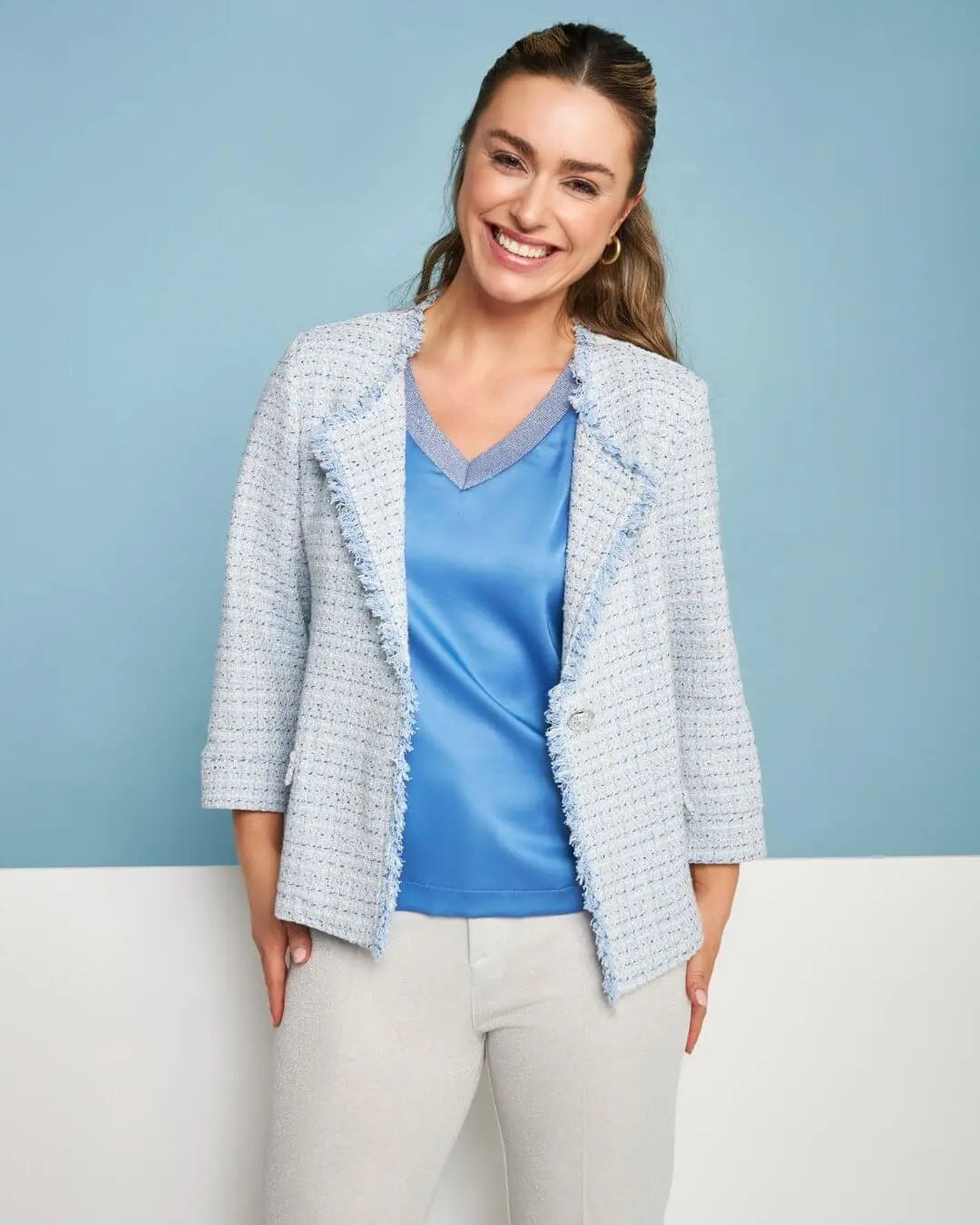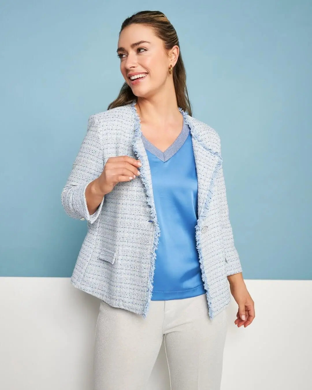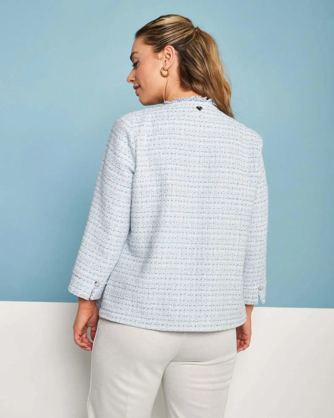 Chaqueta de tweed de lurex con abotonadura sencilla, bordes deshilachados y botones metálicos AZUL