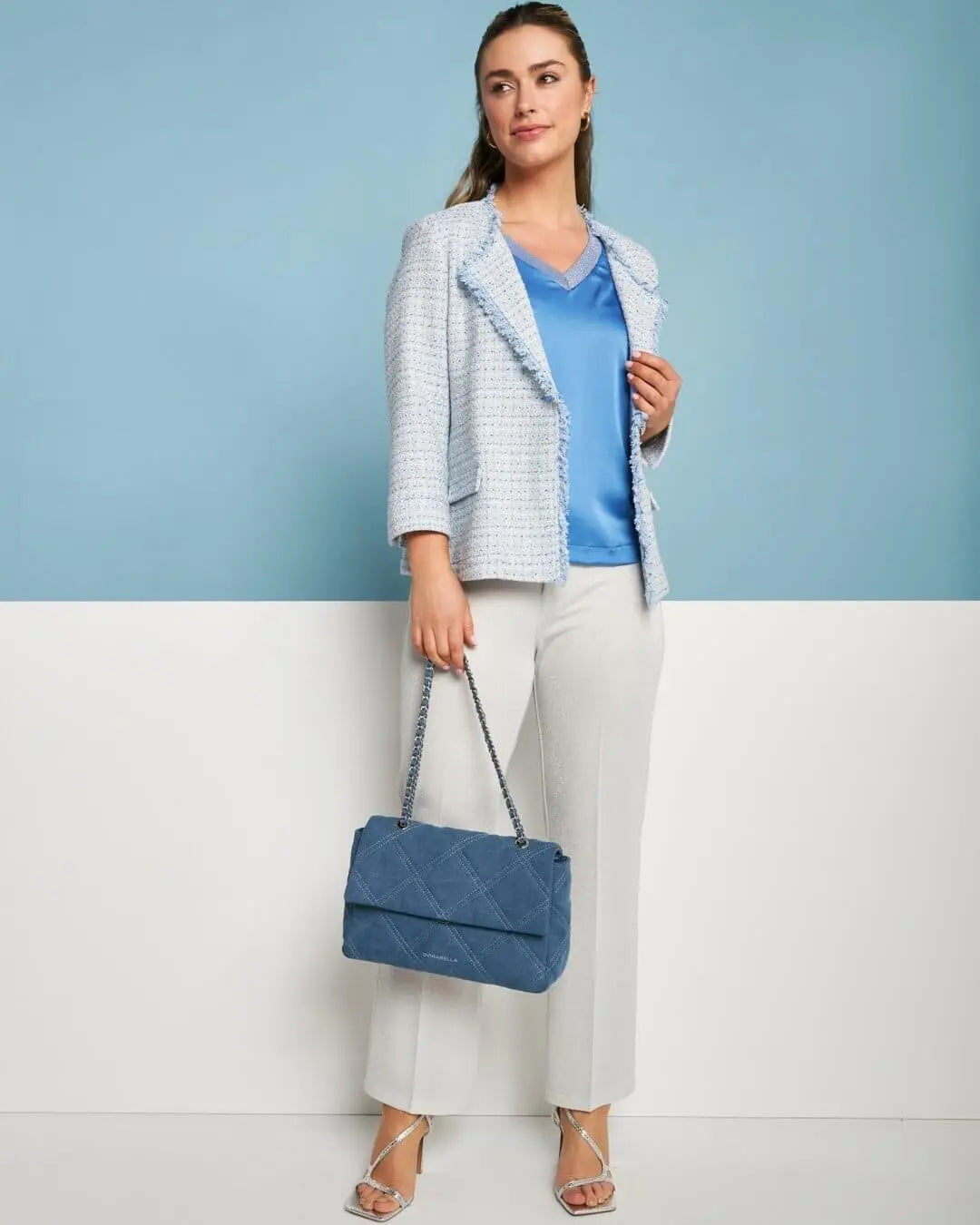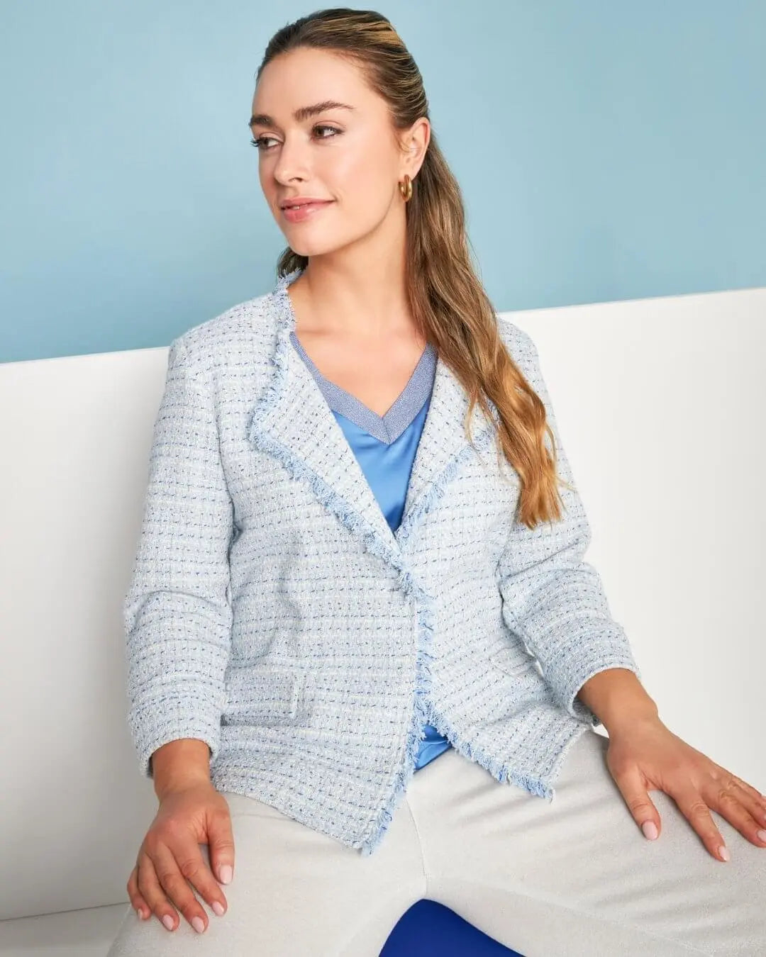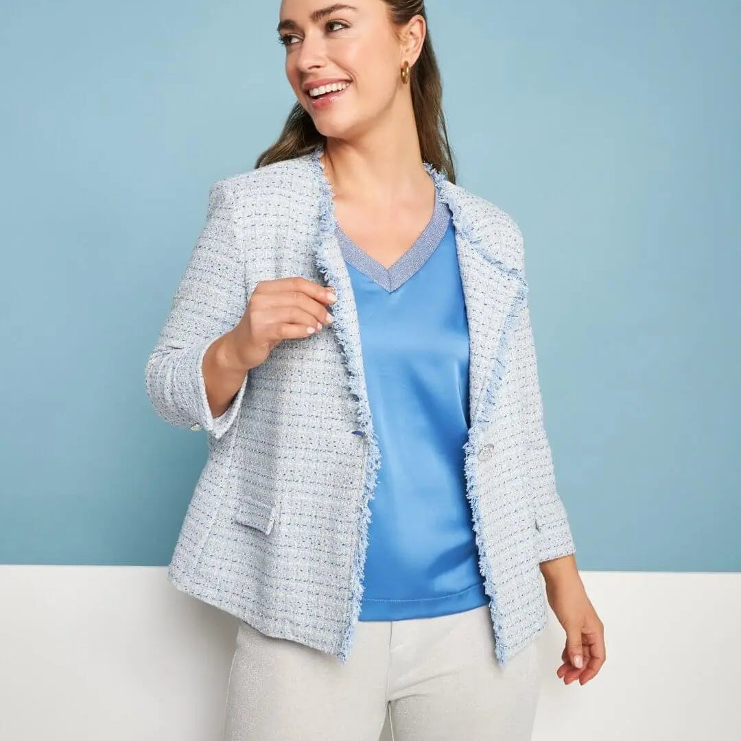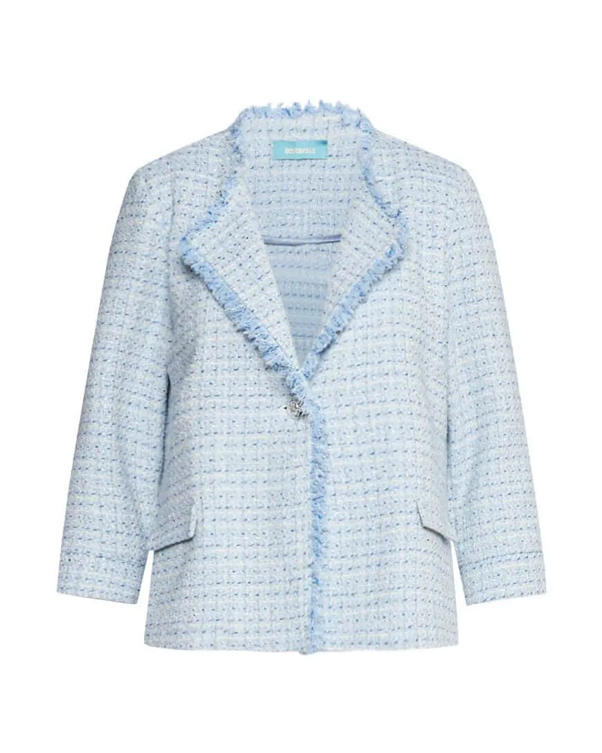 Chaqueta de tweed de lurex con abotonadura sencilla, bordes deshilachados y botones metálicos AZUL
