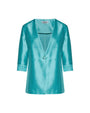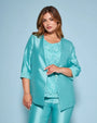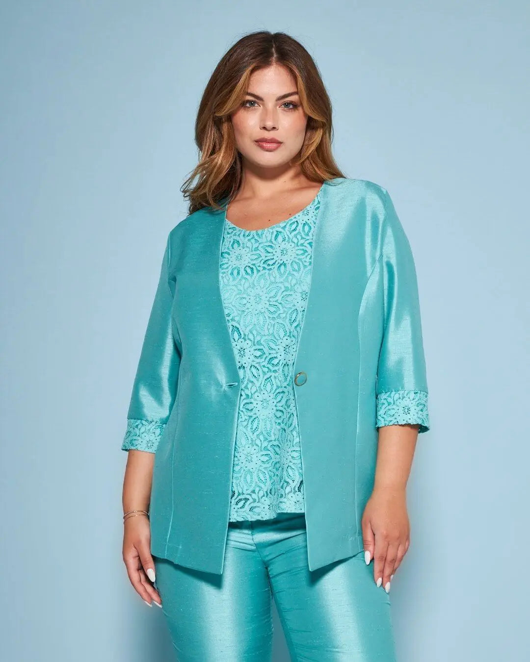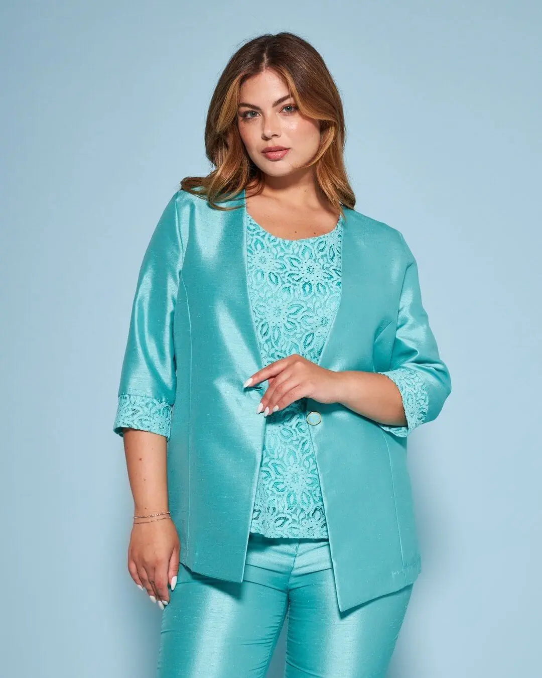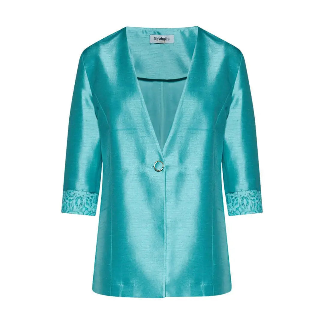 Chaqueta de shantung de botonadura sencilla sin cuello con inserción de encaje en el bajo de la manga AGUA