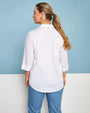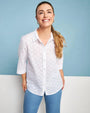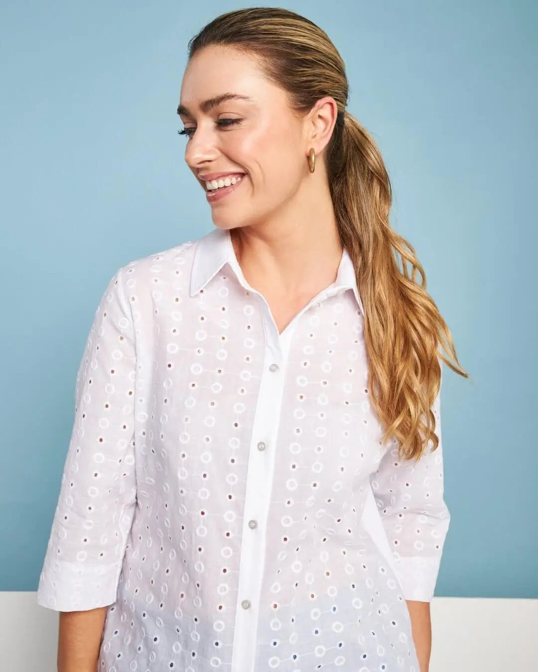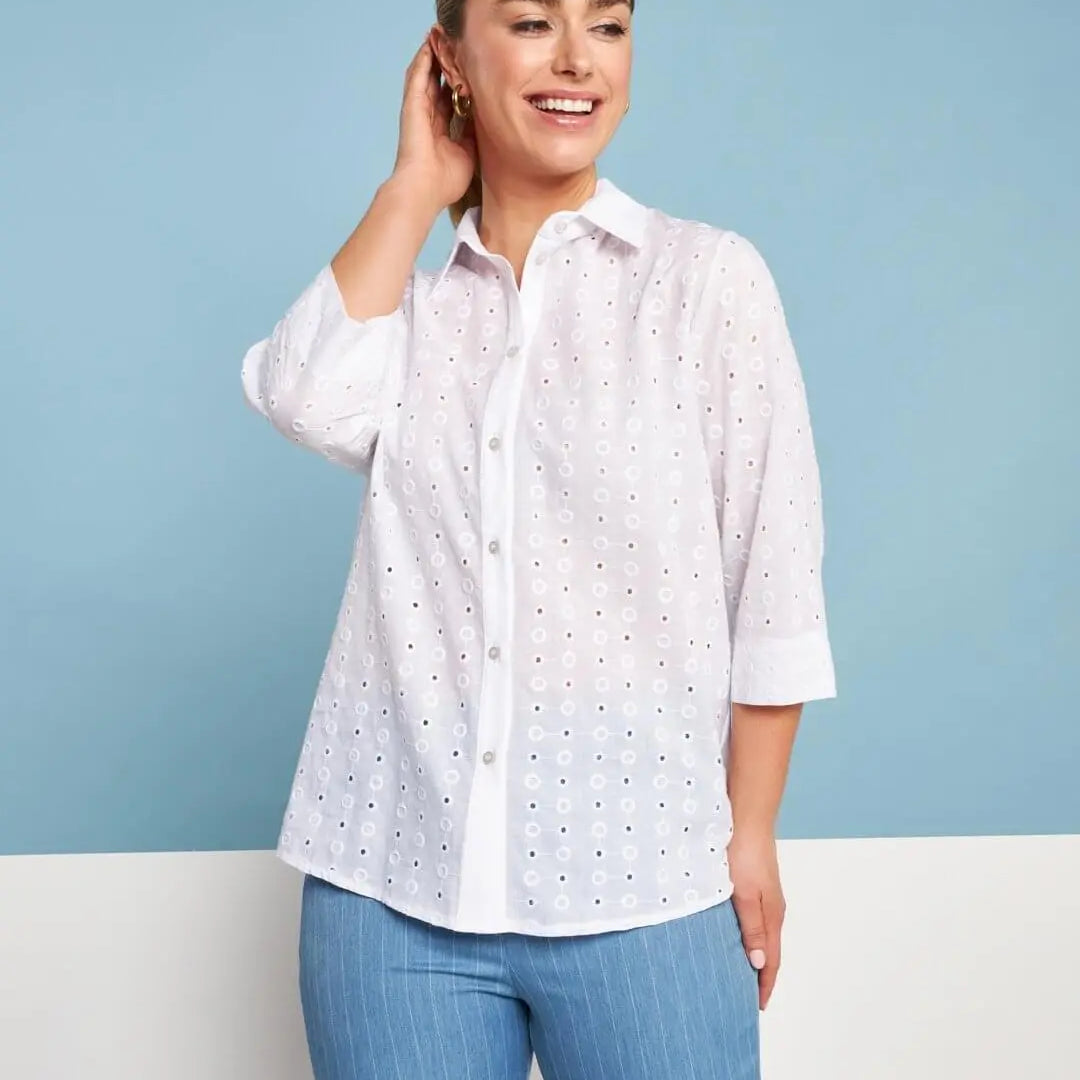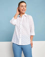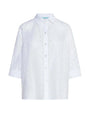 Camisa de encaje Sangallo con espalda y cuello de popelina y mangas tres cuartos BLANCA