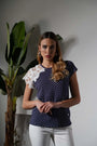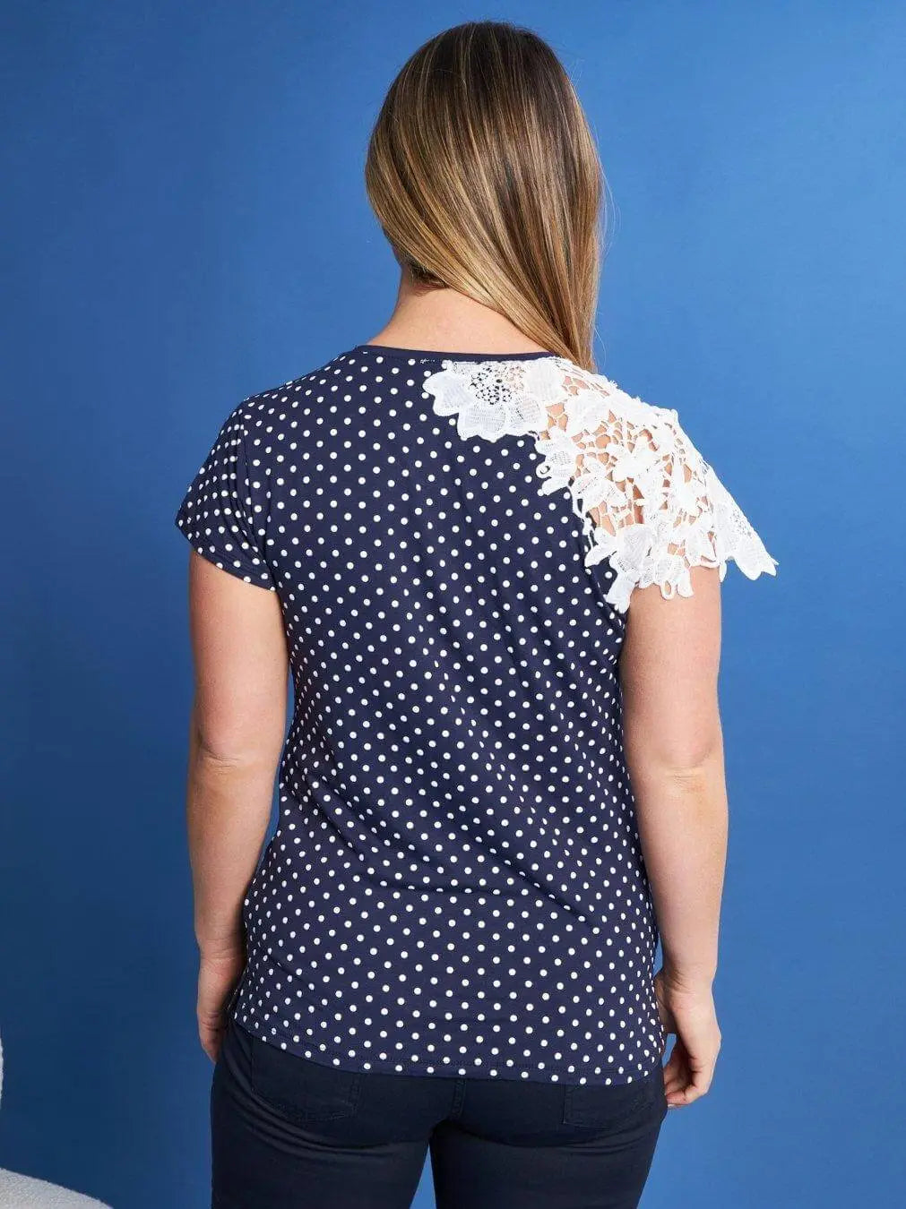 Camiseta de jersey de viscosa con estampado de lunares y aplicación de encaje macramé AZUL