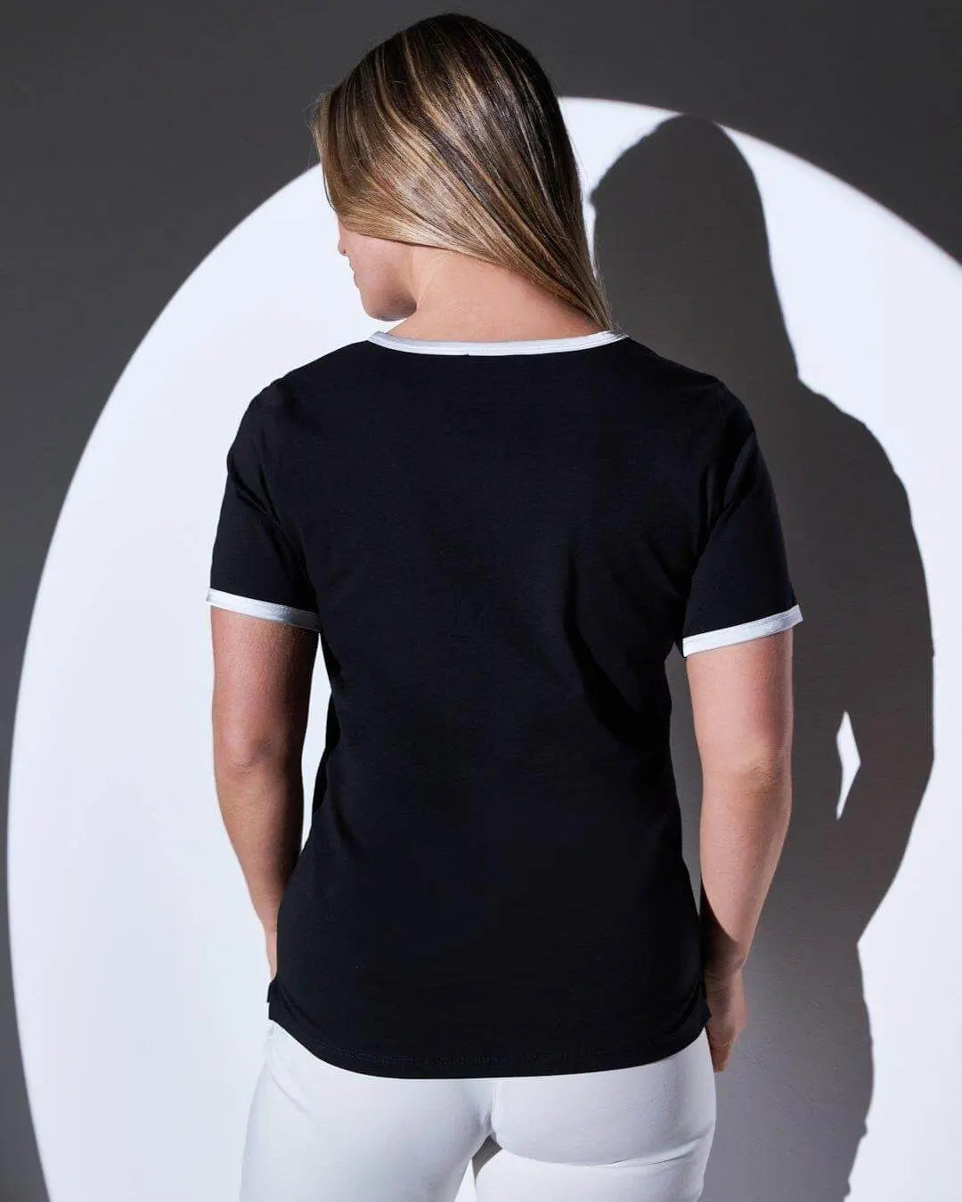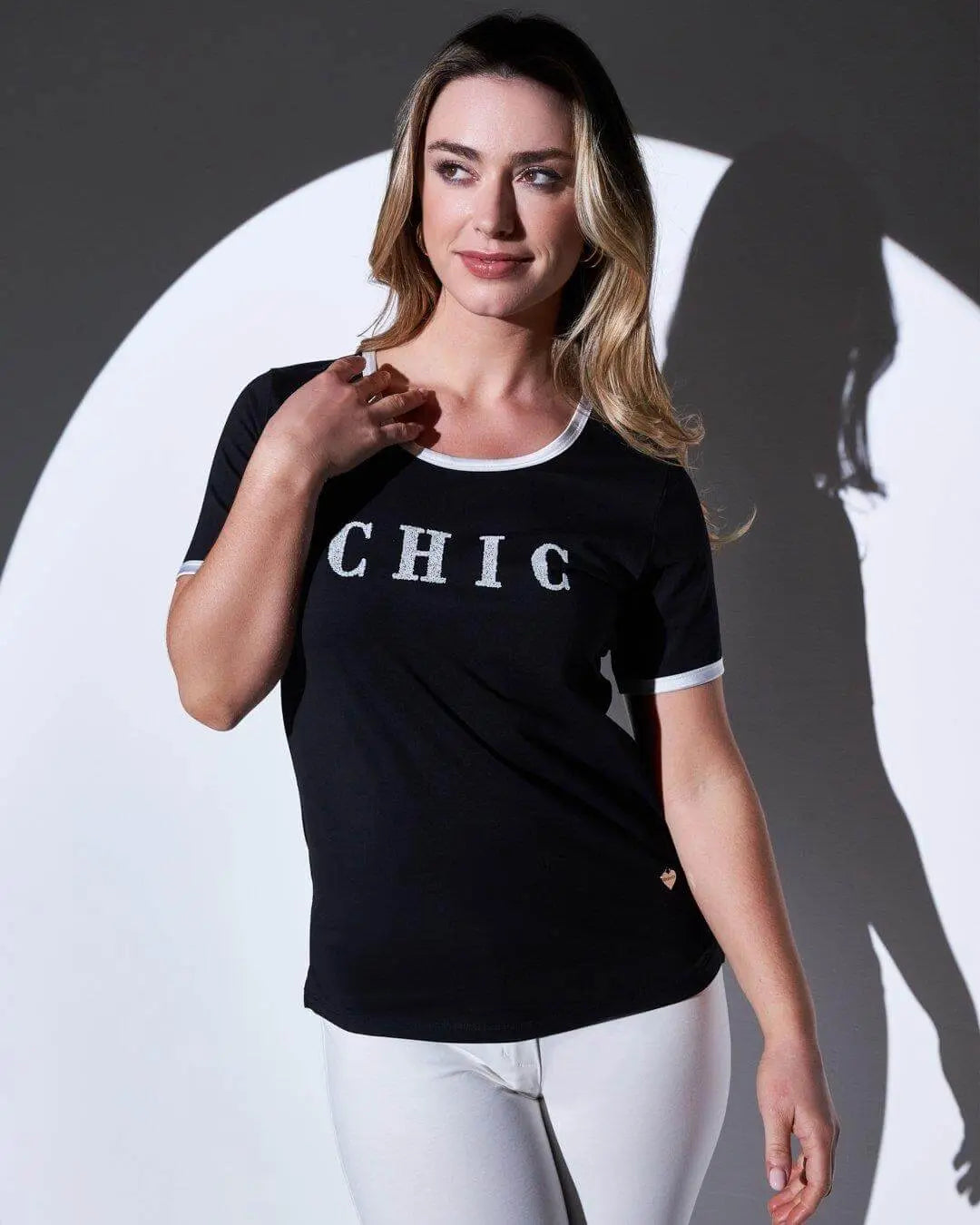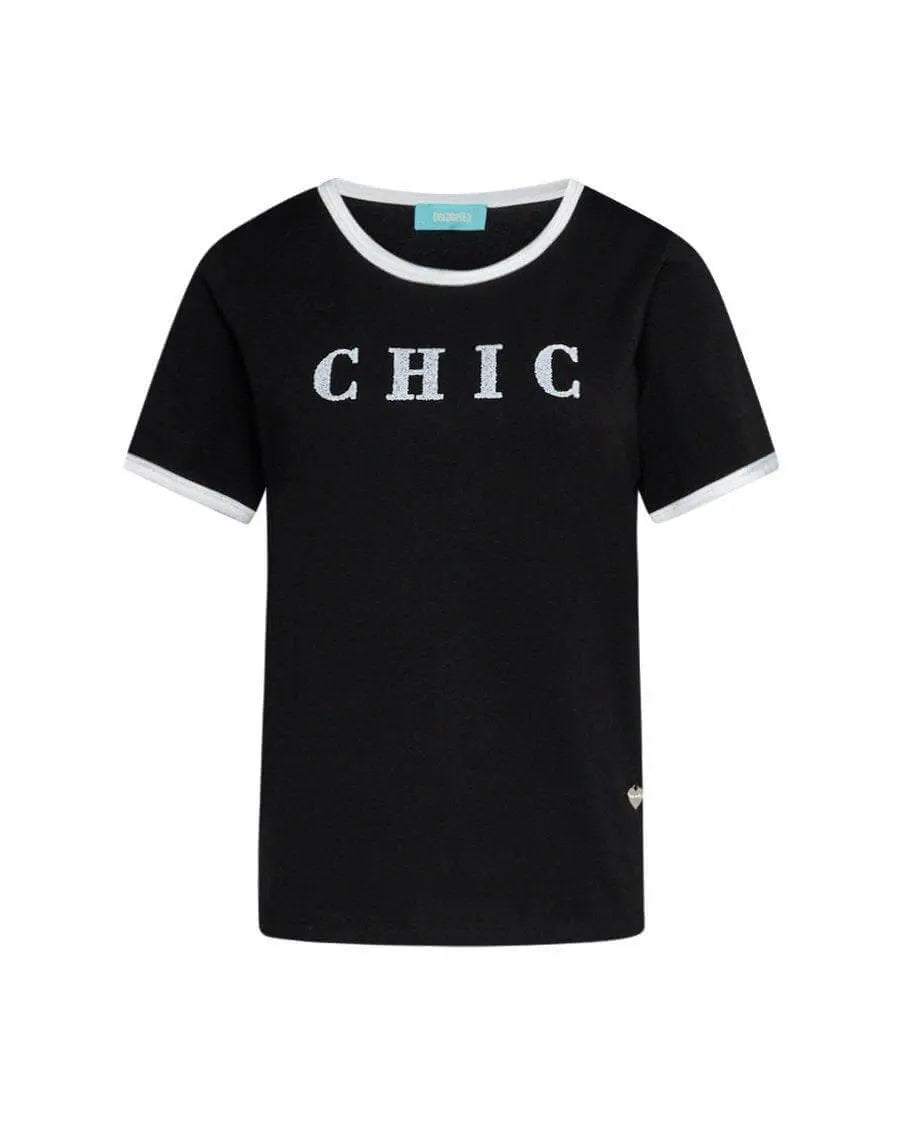 Camiseta de jersey de algodón elástico con ribete de satén y eslogan de lentejuelas NEGRO