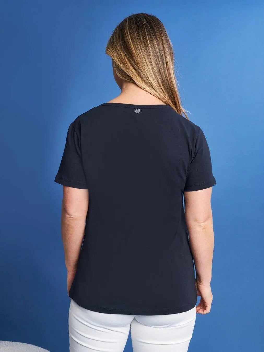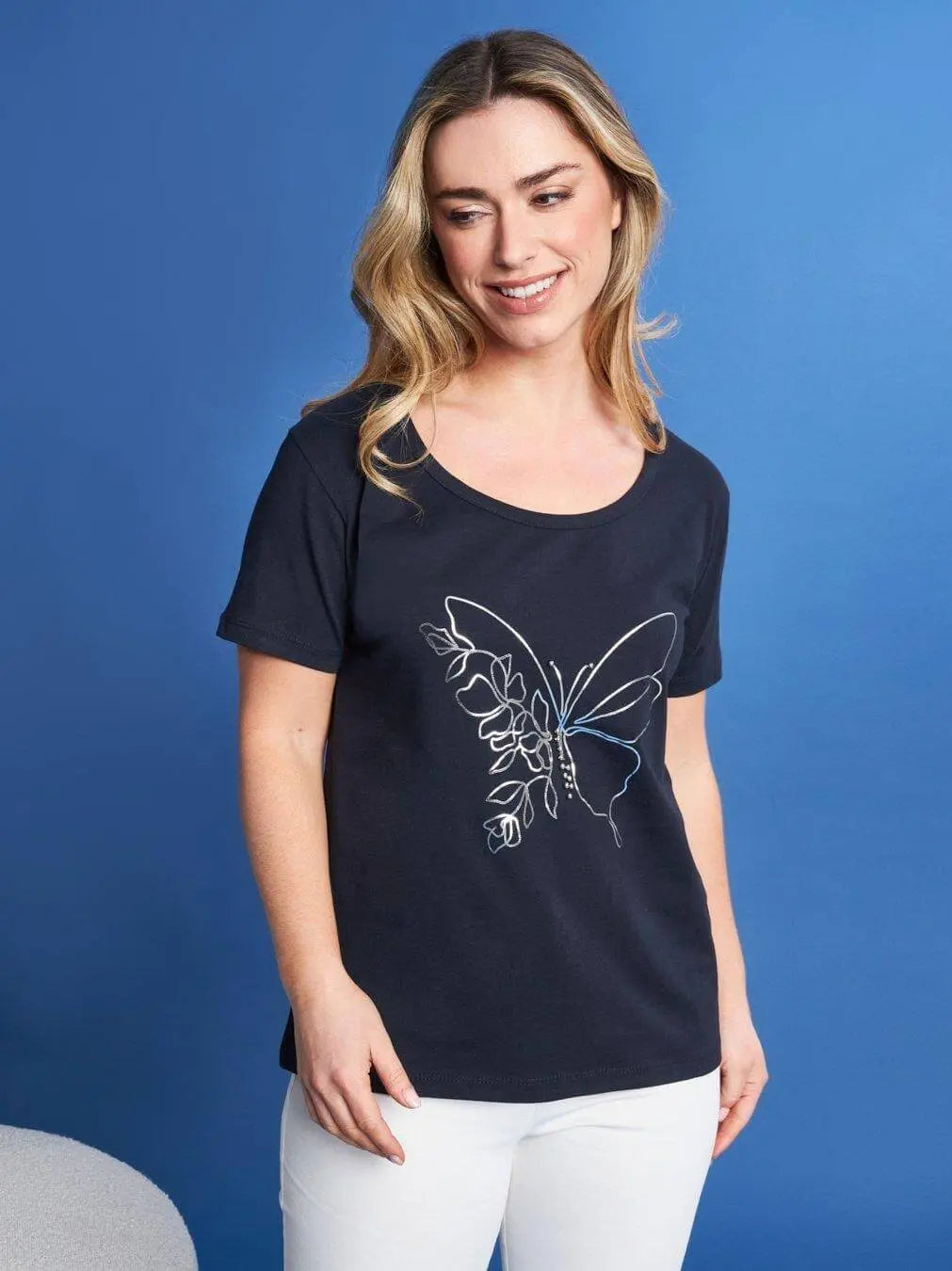 Camiseta de media manga de jersey de algodón elástico con estampado de mariposas metalizadas AZUL AZUL MARINO