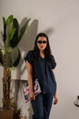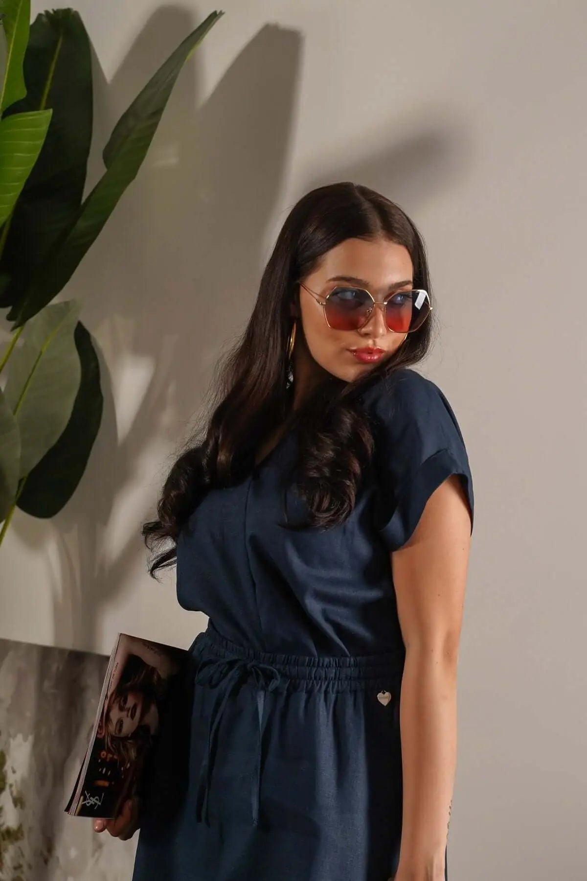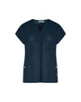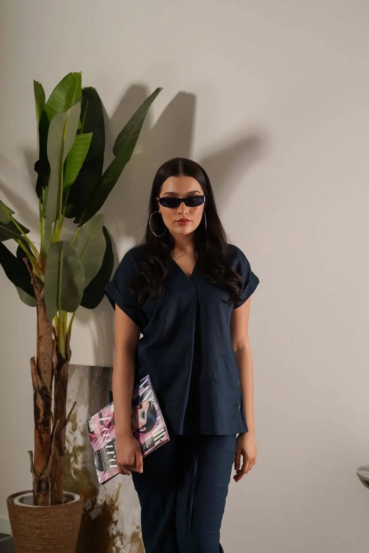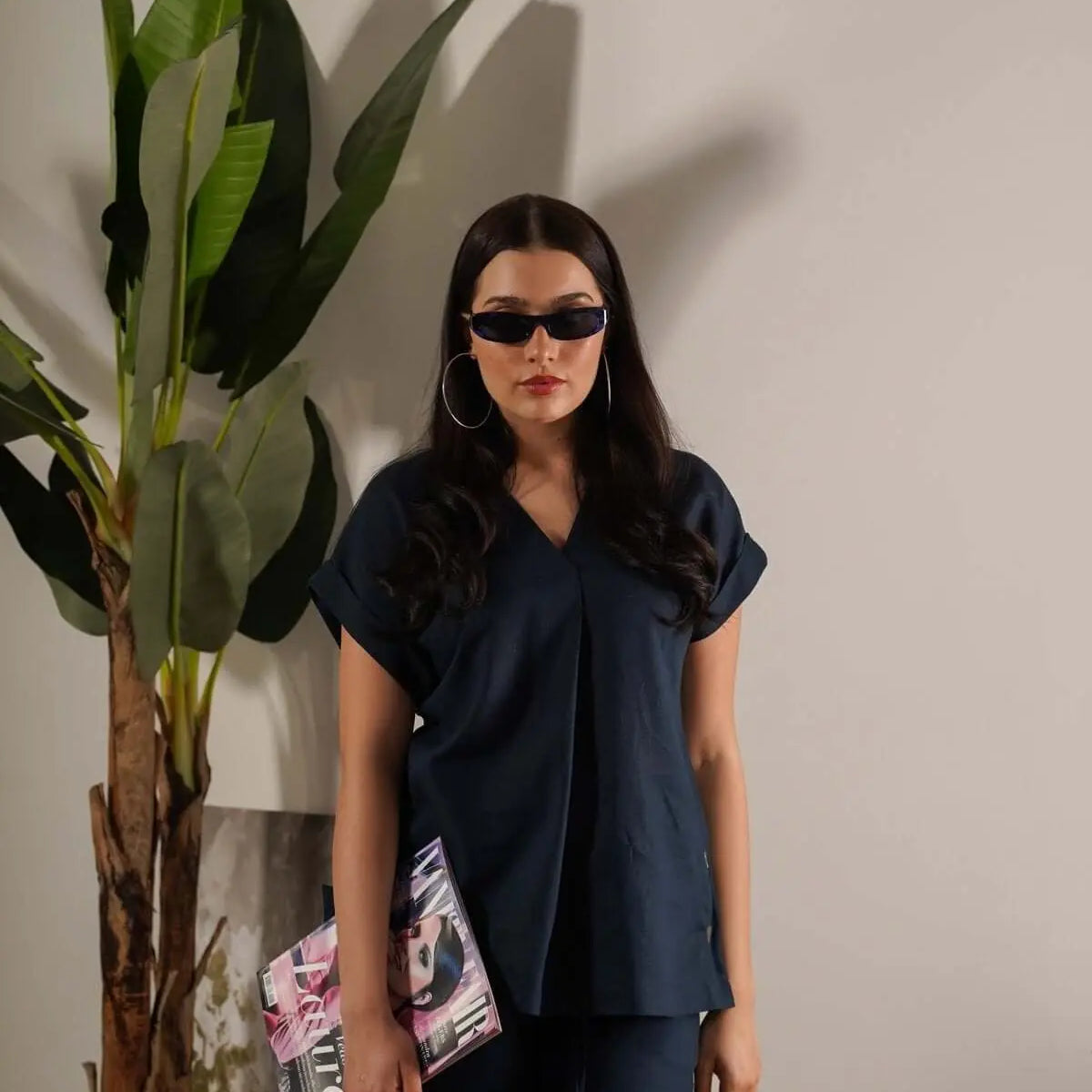 Blusa lisa de mezcla de lino con botones y pliegues AZUL