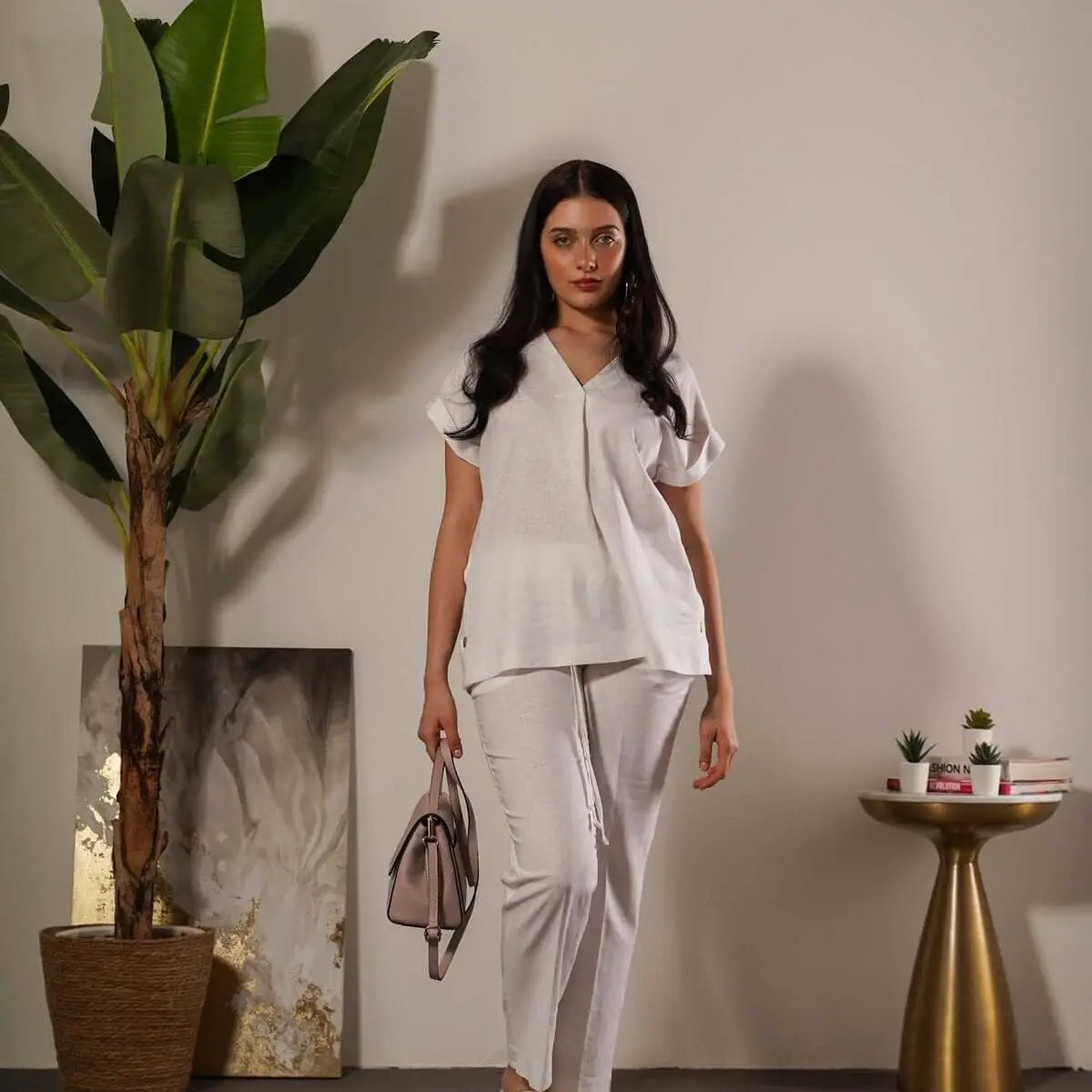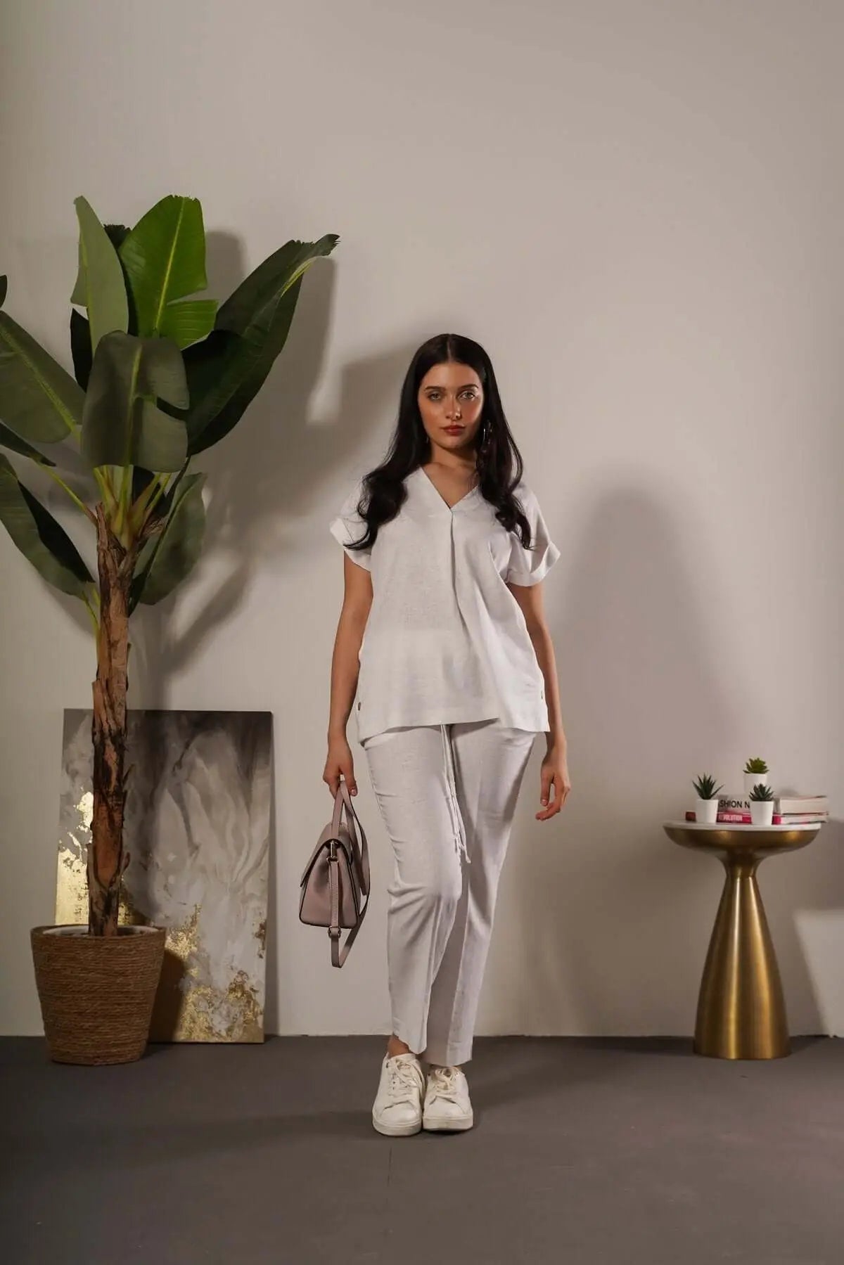 Pantalón cónico en mezcla de lino y rayón con cintura con cordón. BLANQUECINO