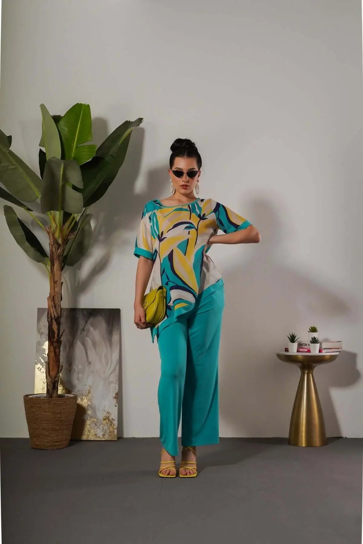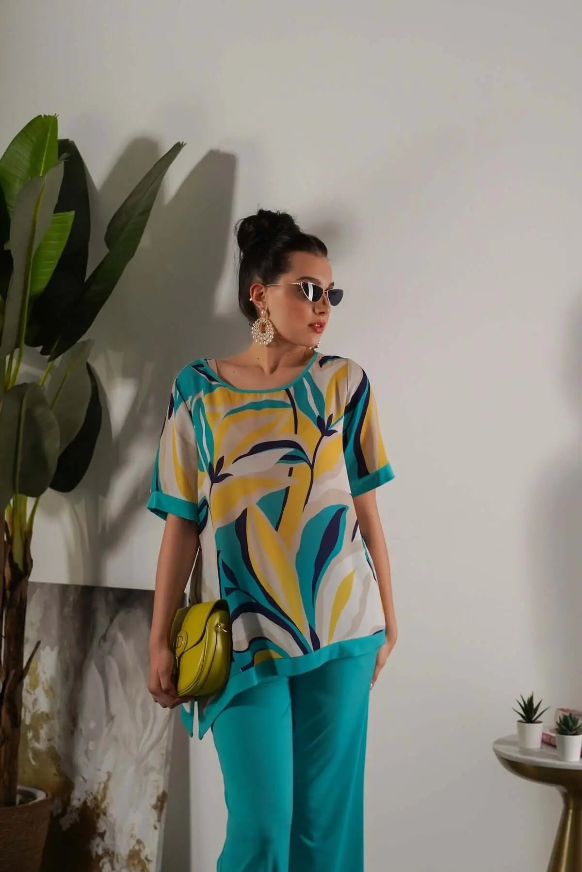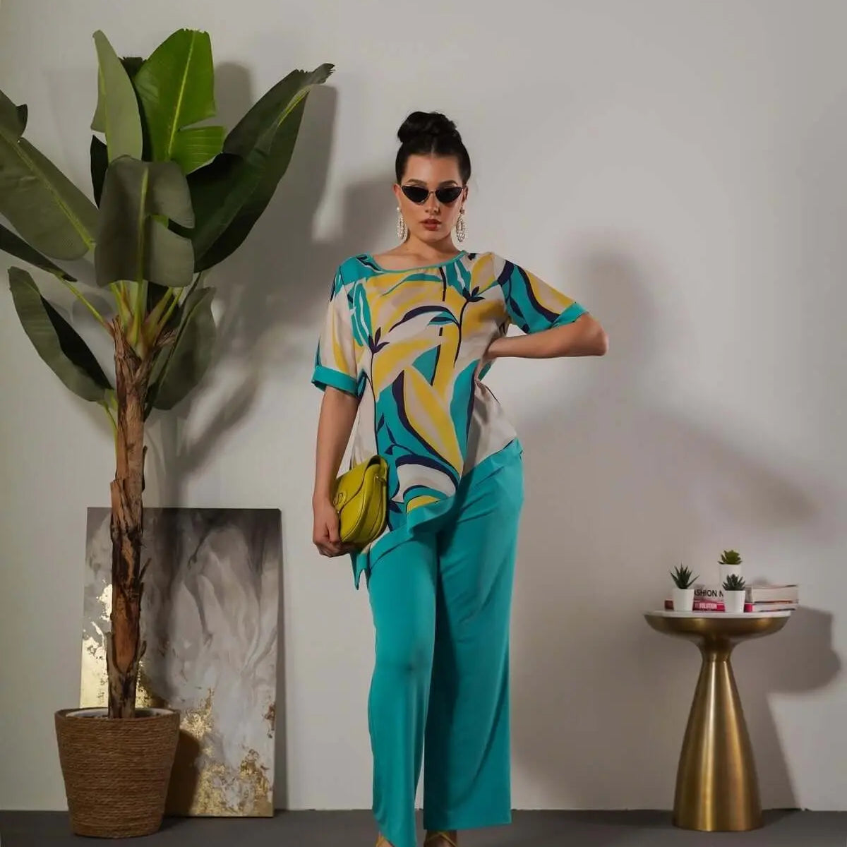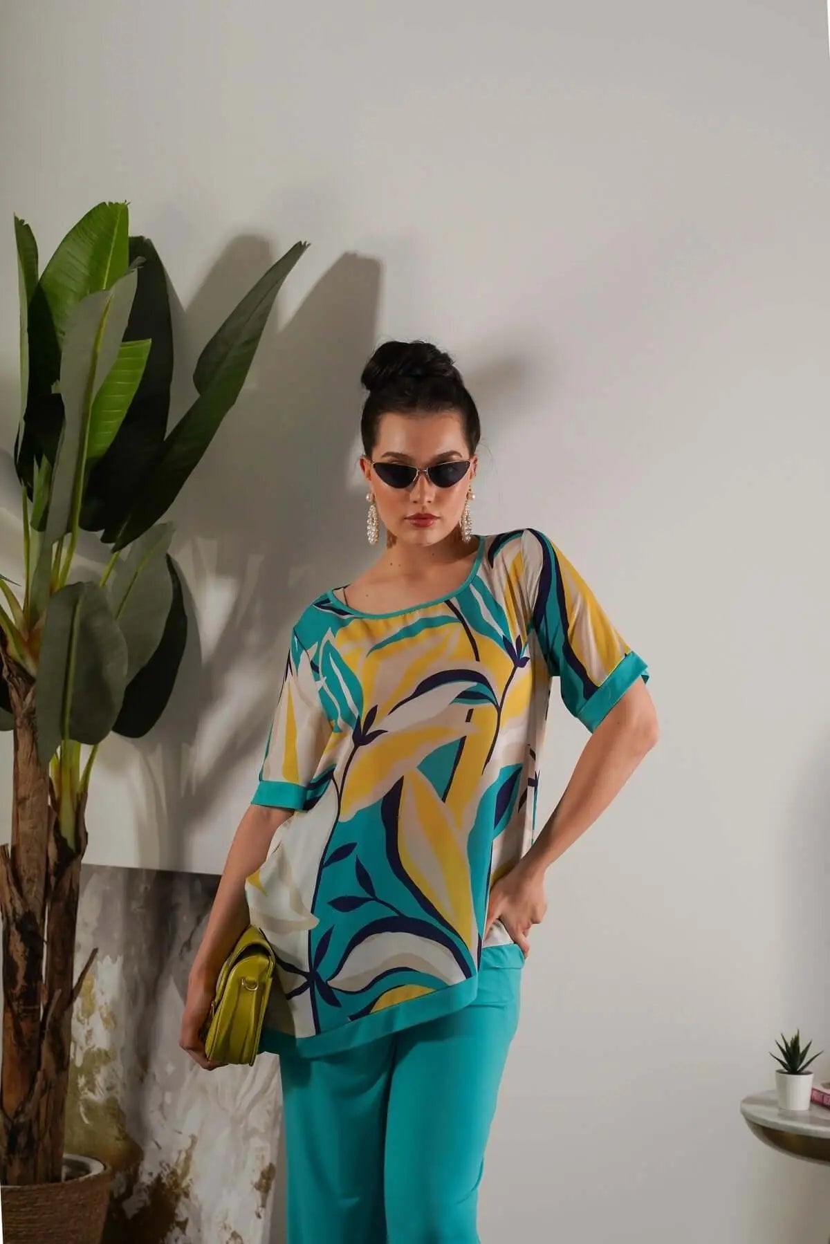 Conjunto estampado floral compuesto por blusa y pantalón. La blusa presenta un corte asimétrico en la parte inferior, media manga y está firmada por el medallón del logo en forma de corazón en la espalda. El pantalón, de color liso y pierna recta, está diseñado con cinturilla elástica para una mayor comodidad.
