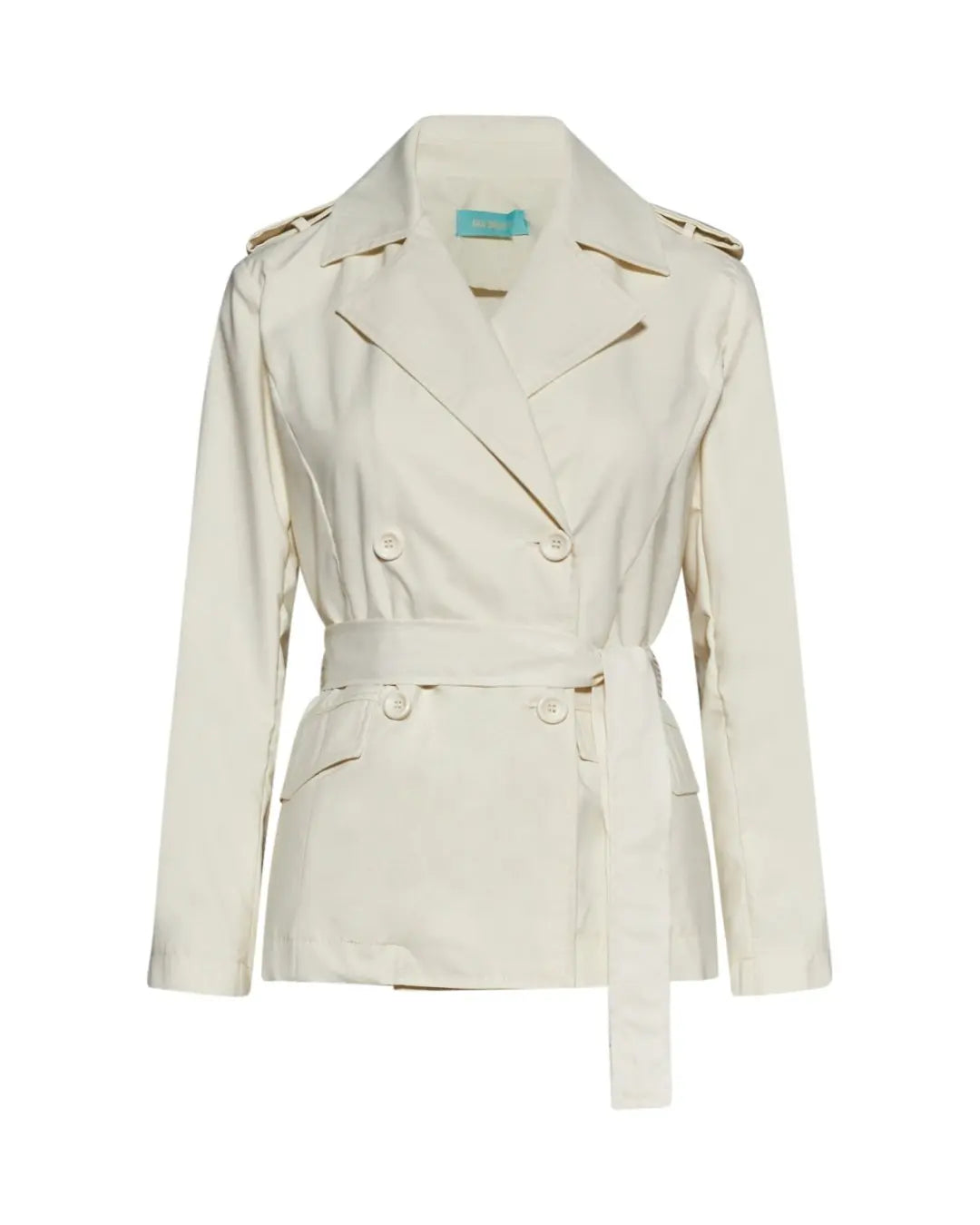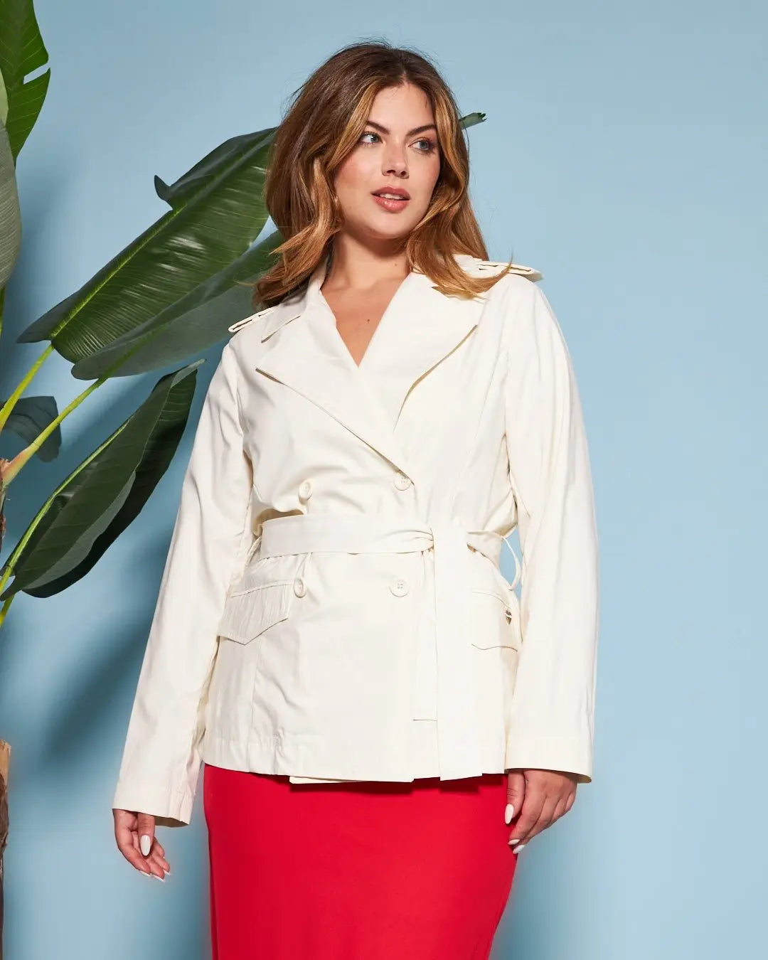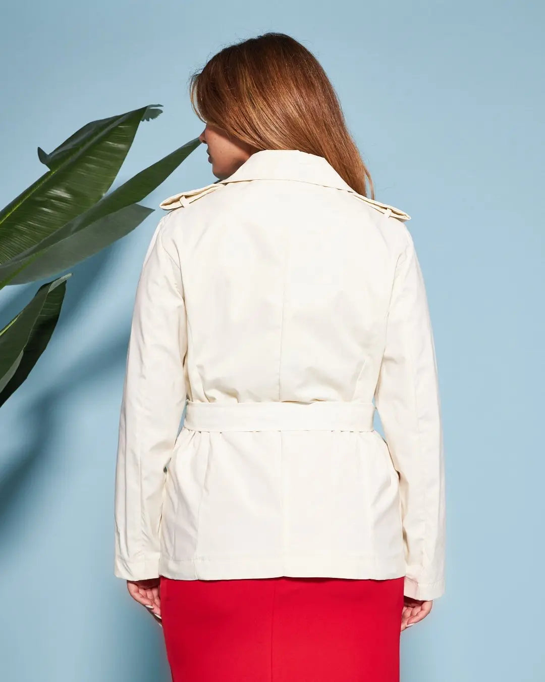 Gabardina corta cruzada en nylon de color liso con cinturón en la cintura. CREMA
