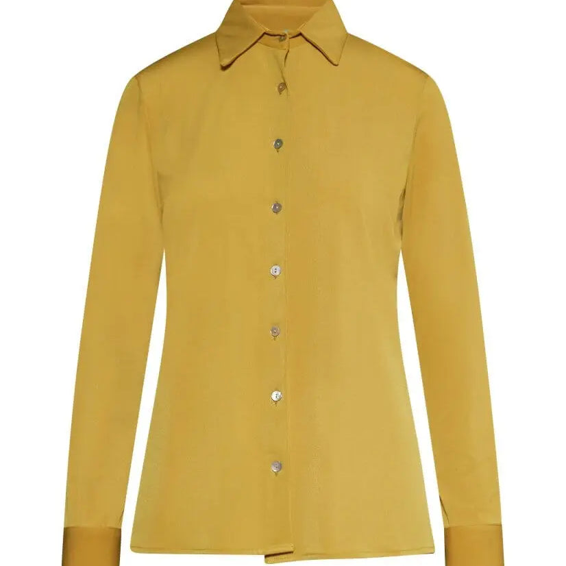 Camisa de jersey elástico de color liso con mangas tres cuartos. MOSTAZA