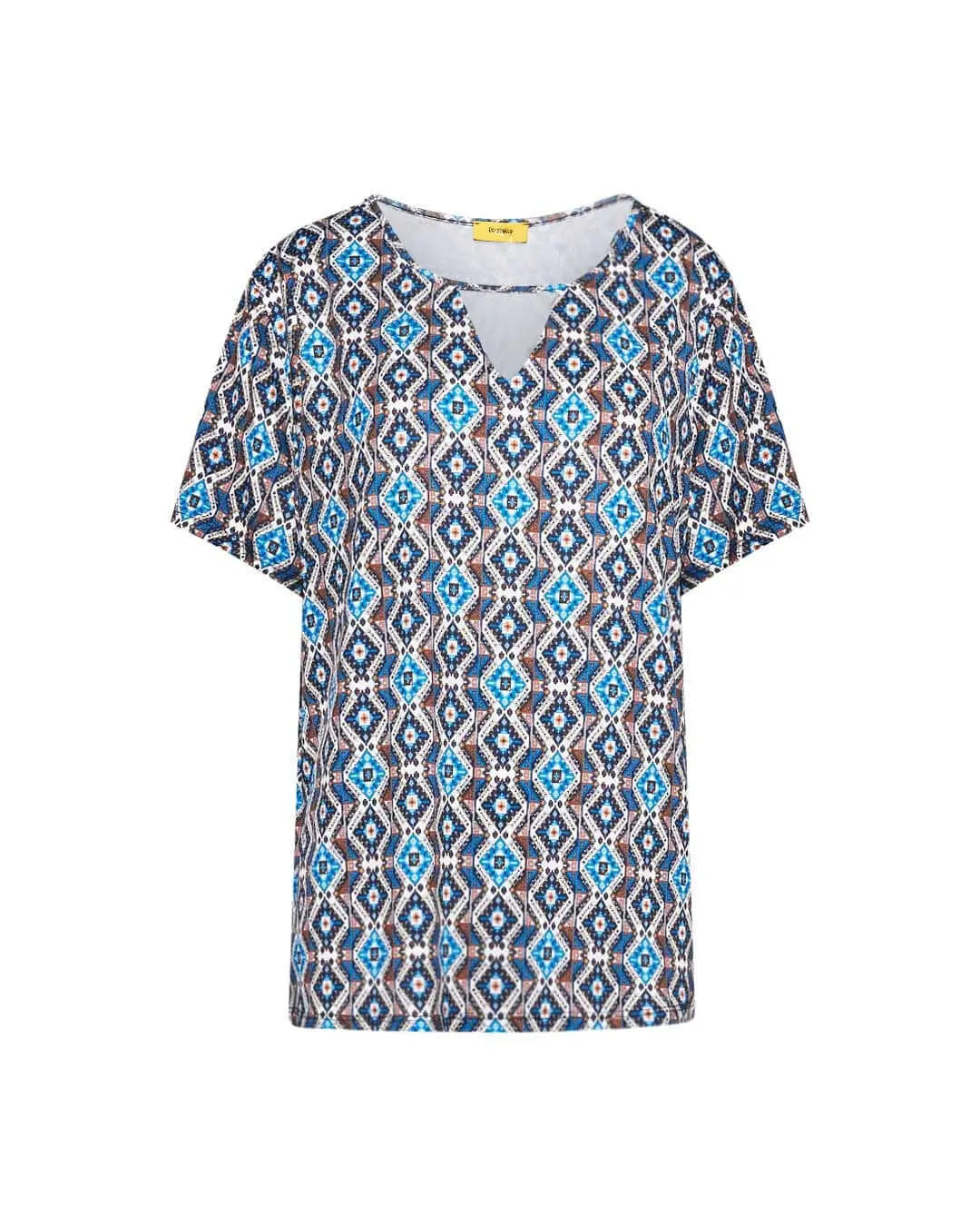 Blusa de manga corta en jersey elástico con estampado de mayólica y escote en pico con abertura en la parte delantera y abertura AZUL