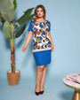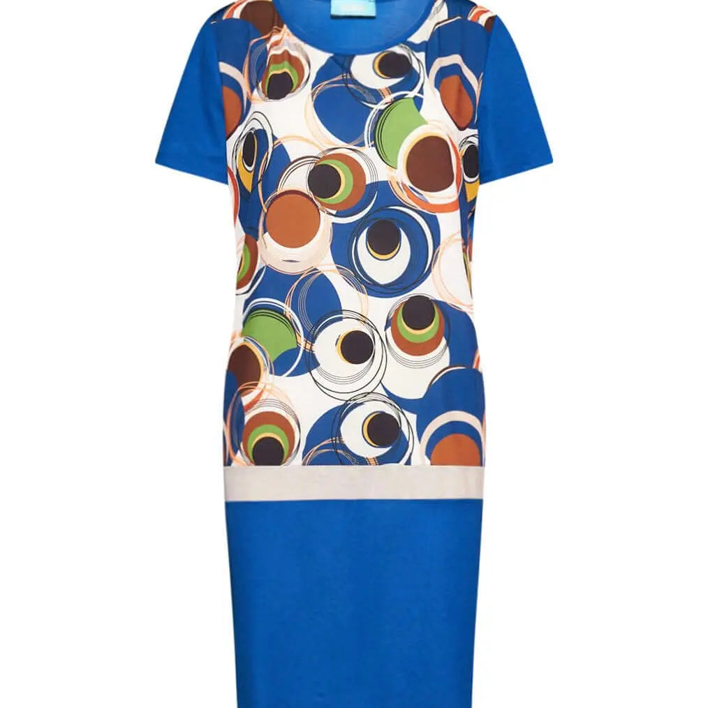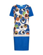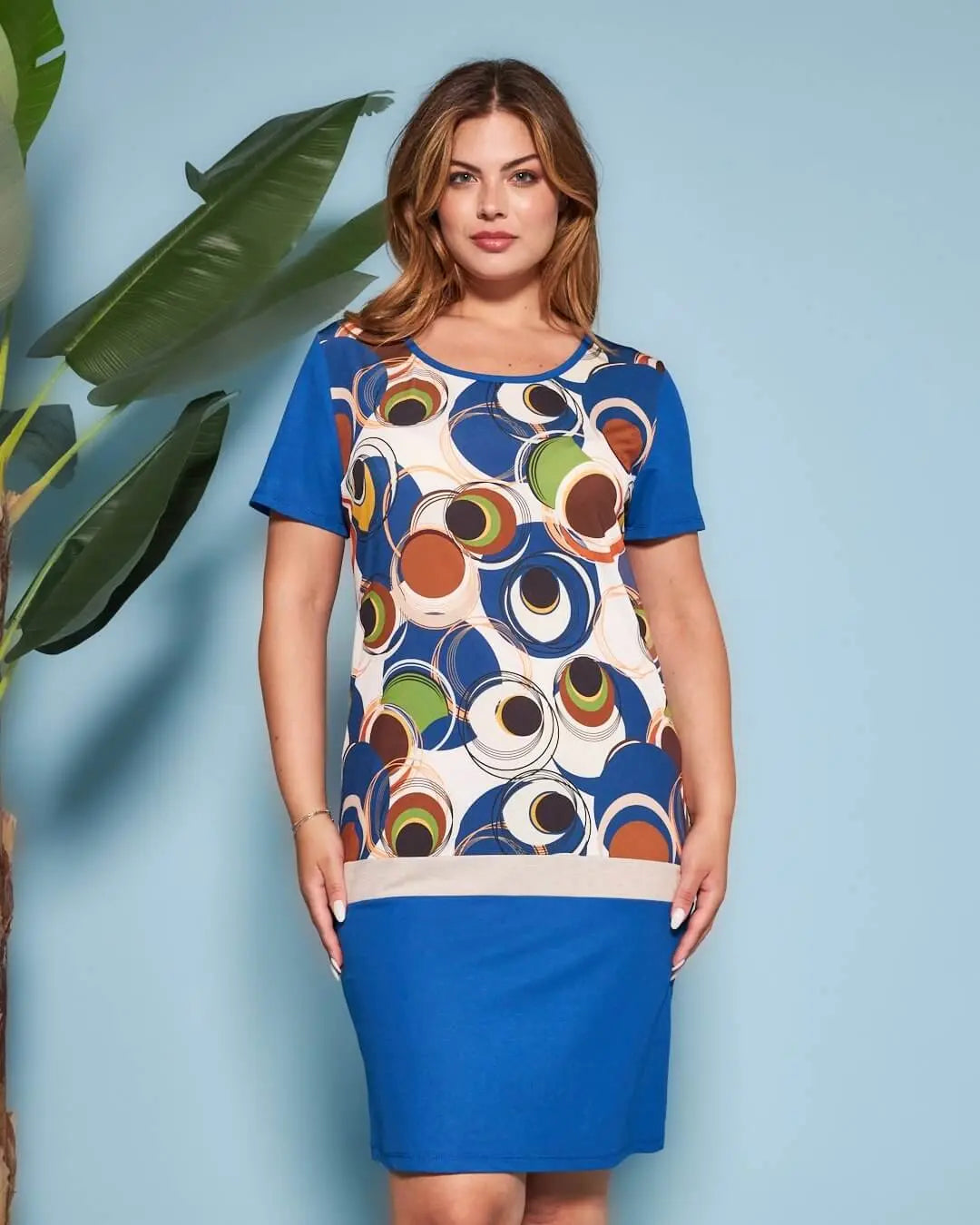 Vestido recto de manga corta en mezcla de viscosa con panel de jersey elástico con estampado opti CIELO