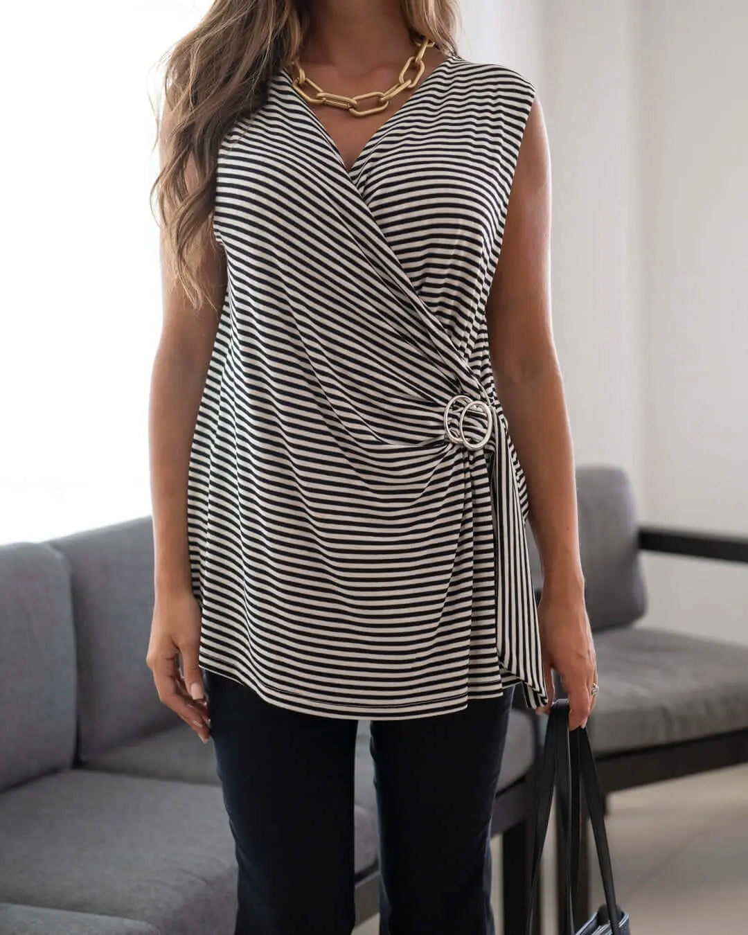 Top sin mangas en mezcla de viscosa y lurex con estampado de rayas y detalle de anilla metálica. BLANCO-AZUL