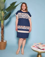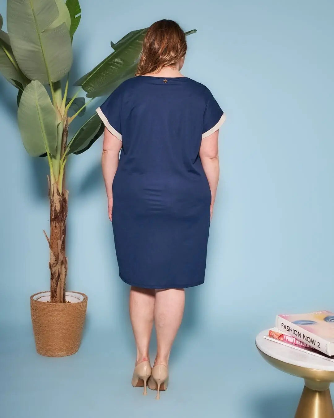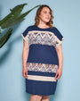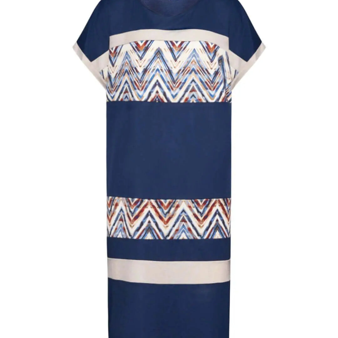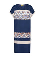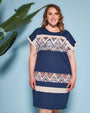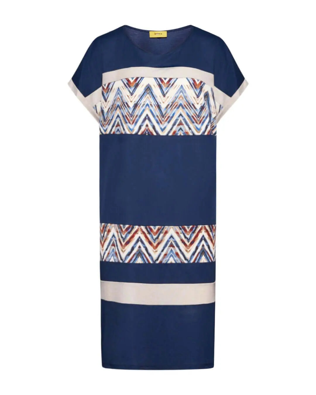 Vestido recto en mezcla de viscosa con paneles de jersey elástico con estampado multicolor y mangas DENIM