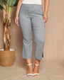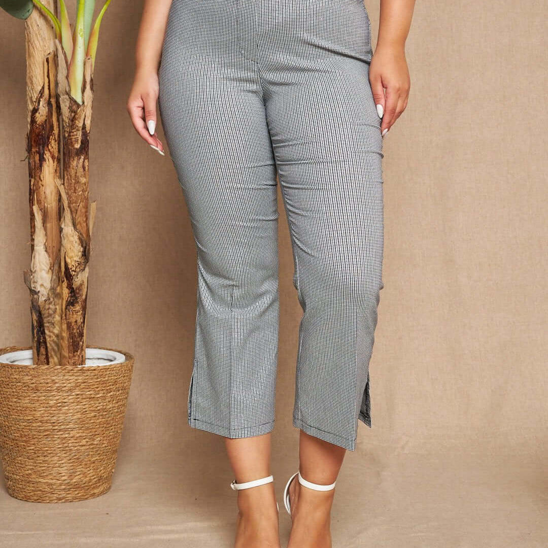 Pantalón capri con pernera acampanada en mezcla de viscosa elástica con estampado de mayólica. BLANCO Y NEGRO